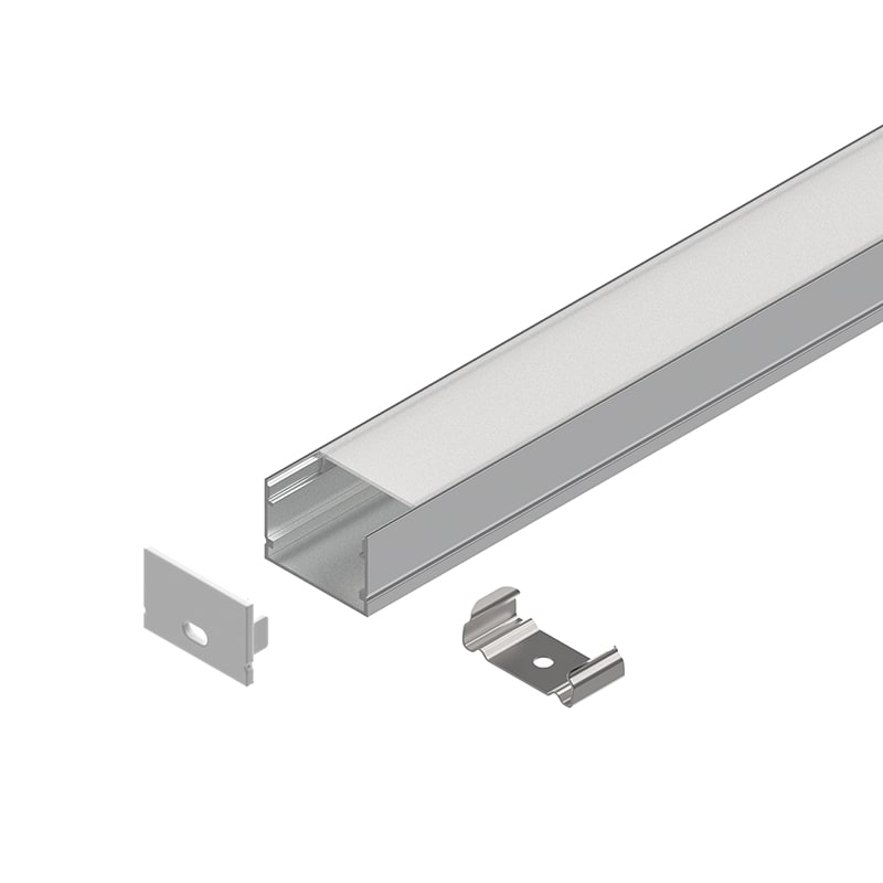 PROFILED MACRO :Profilo dissipante per Strip LED doppia pista 25W/m, in lega di alluminio anodizzato naturale o verniciata bianca, testate di chiusura in polimero termoplastico, schermo diffusore ad inserimento a scatto in PC opale. Schermo diffusore, testate di chiusura e 4 staffe di fissaggio inclusi. Strip LED e alimentatore 24Vdc da ordinare a parte. Non esporre a intemperie o luce solare diretta e non inserire in materiale isolante.