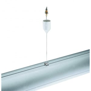 Cavi in acciaio con staffe di fissaggio a plafone in ottone, rosone in ABS bianco (RAL 9016).