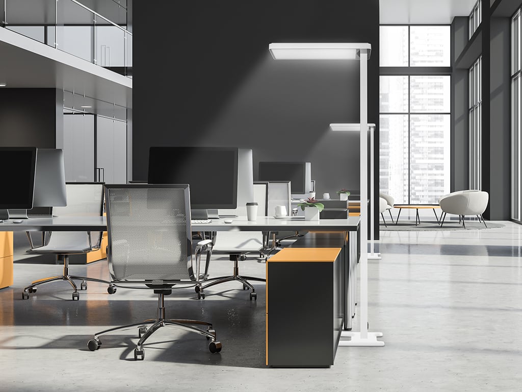 Moderna piantana con emissione diretta/indiretta della luce. Luce estremamente confortevole (UGR < 16). Elegante touch panel. Sensore di movimento e luce diurna integrato. Elevata efficienza di 125 lm/w. Controllo tramite Smart App, possibilita di collegamento a Smart Sensors.