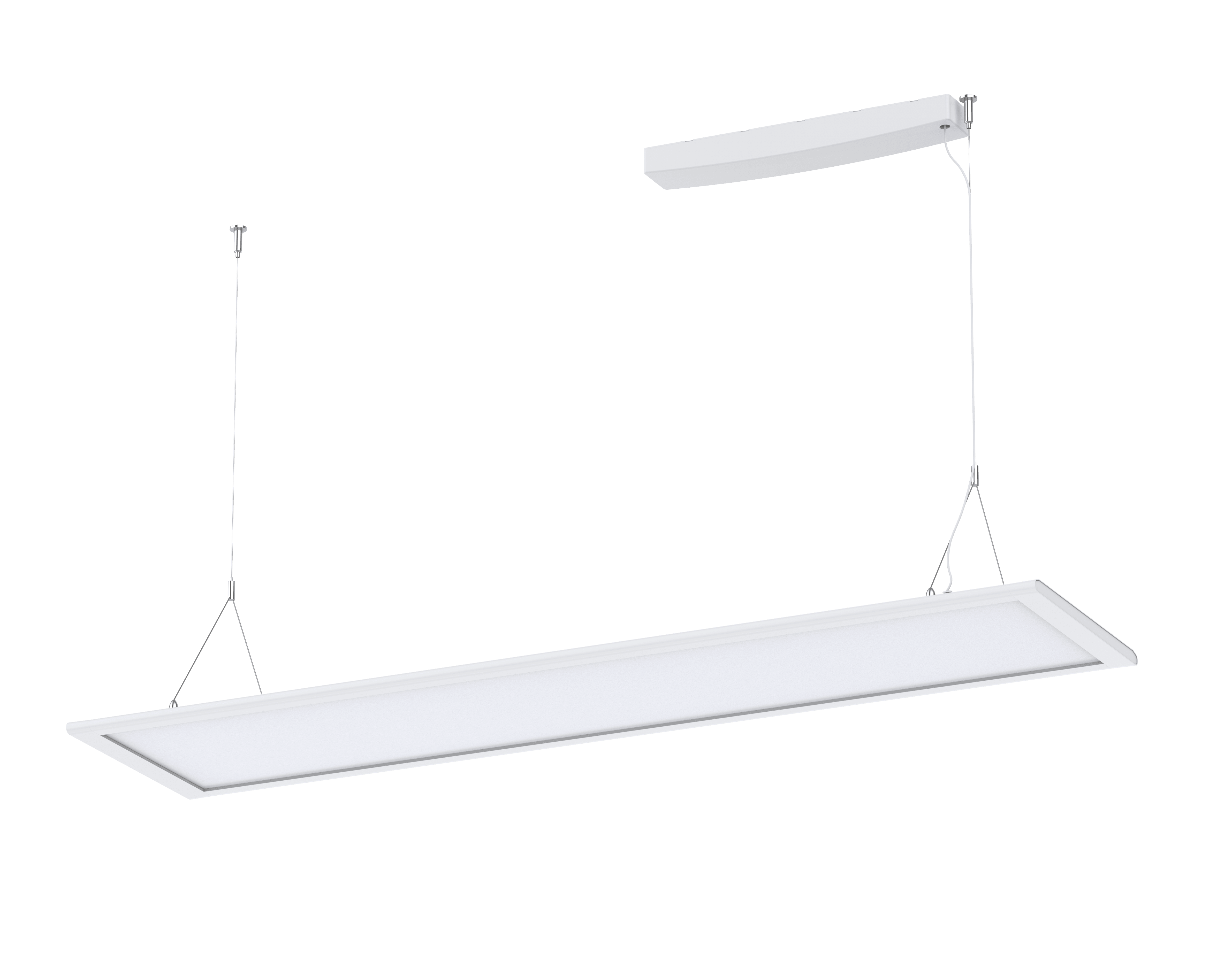 Elegante pannello LED a sospensione con emissione diretta/indiretta. Design minimalista. Basso abbagliamento UGR19 adatto per applicazione in uffici. Deep Switch CCT 3000/3500/4000K e Deep Switch di potenza.