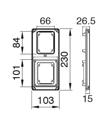Flangia per il montaggio di 2 prese fisse IP44, IP67 industriali e calotte per prese civili IP66/IP67. In dotazione n°1 cornice di finitura per fissaggio prese compatte, n°1 flangia cieca da 65 x 83 mm.