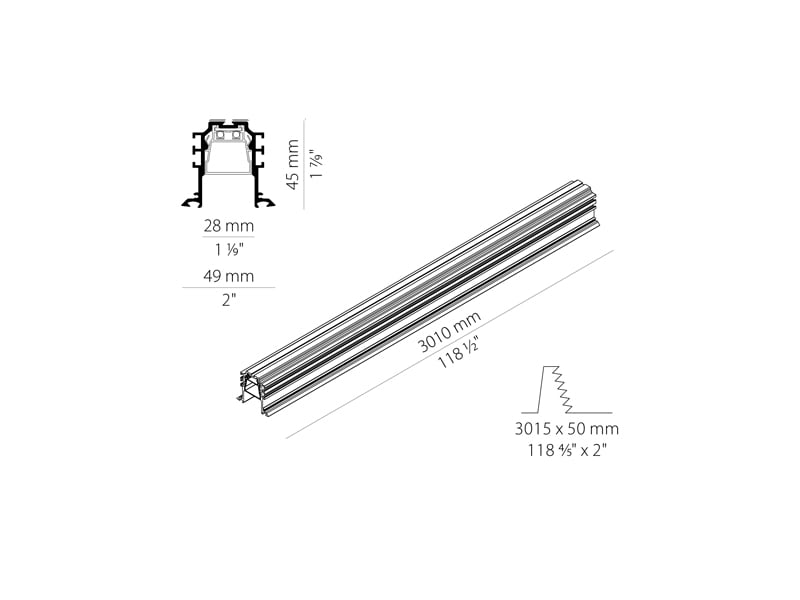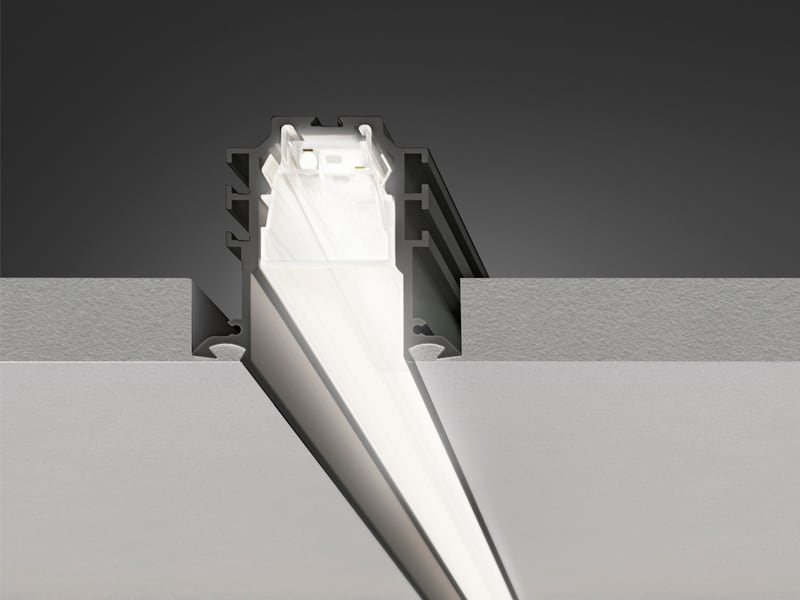 Profilo in alluminio estruso ad incasso, completo di diffusore in policarbonato estruso, studiato per consentire l’installazione su pannelli in cartongesso di diversi spessori (12,5mm e 25mm), grazie alla possibilità di posizionare gli elementi di fissaggio su due diversi livelli. La sorgente luminosa è inserita all’interno del diffusore in policarbonato estruso, rimovibile a scatto, permettendo una semplice installazione. 24W/m. 24 VDC. L=3010 mm