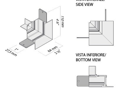 Elemento di collegamento per due linee di profili componibili con angolo 3 di giunzione verticale interno di 90° per installazione incassta a scomparsa parete-parete / soffitto-soffitto misure esterne 64x64mm. Bianco opaco.