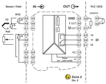 Compensazione punto freddo con connettore separato. Configurazione mediante software (FDT-DTM) o mediante unità di comando e visualizzazione IFS-OP-UNIT.