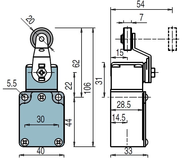 Interruttore di posizione a leva girevole con rotella centrale, Custodia metallica, una entrata cavi filettata, IP67 secondo IEC 60529 con pressacavo avente grado di protezione uguale o superiore, 1NO-1NC scatto rapido.