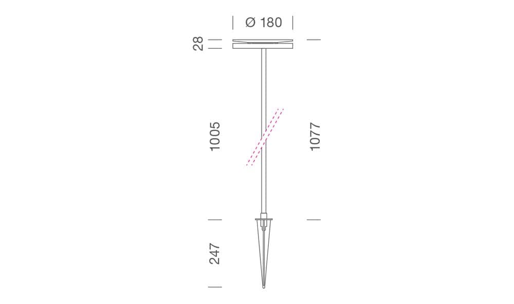 CHIODO - H. 1105 mm - 3000K - Testa in alluminio trattato e verniciato nero. Asta in alluminio rivestito in fibra di carbonio. Picchetto per il fissaggio nel terreno in acciaio inox AISI 316. Protezione con trattamento di anodizzazione, fondo con polveriepossidiche e verniciatura poliestere. Schermo in PMMA opale diffondente. Assenza di viti a vista. Alimentatore: 220-240V 50/60Hz. Apertura di fascio: Largo. Ottica: 95°. LED COB Bianco 11 W 710 lm 3000K. Finitura nero.