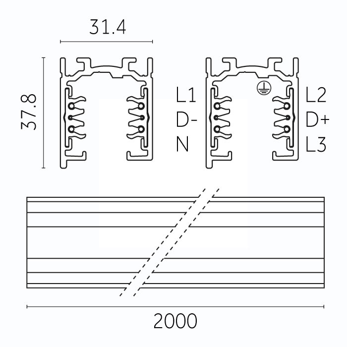 Binario 3 Accensioni + DIMM/DALI - Binario standard. 2000 X 31,4 X 37,8mm. 2,1Kg - Nero.