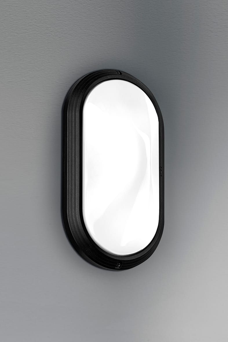 Disponibile nella versione a parete e a plafone. A pparecchio per esterno (IP65) con effetto di lucediffusa. Struttura in materiale termoplastico, dif fusore in policarbonato. Proposto con attacco E27che consente di montare lampadina LED. Disponibile in versione tonda e ovale e in due finiture (bianco e nero). Disponibili giunti certificati IP68 per la realizzazione delle connessioni elettriche, s icure, durevoli e con barriera anticondensa.