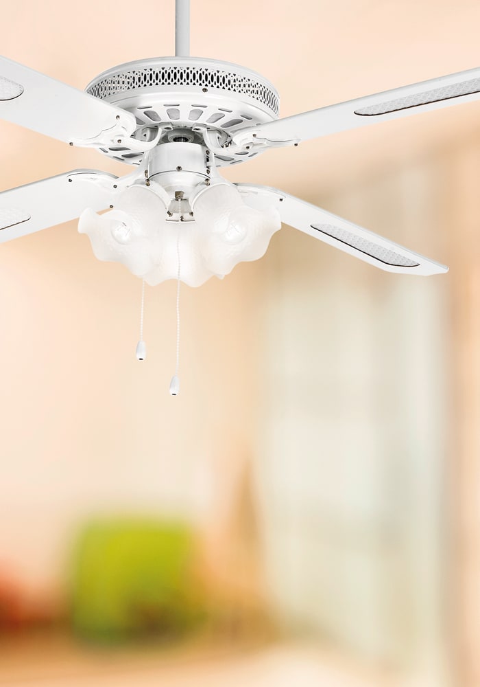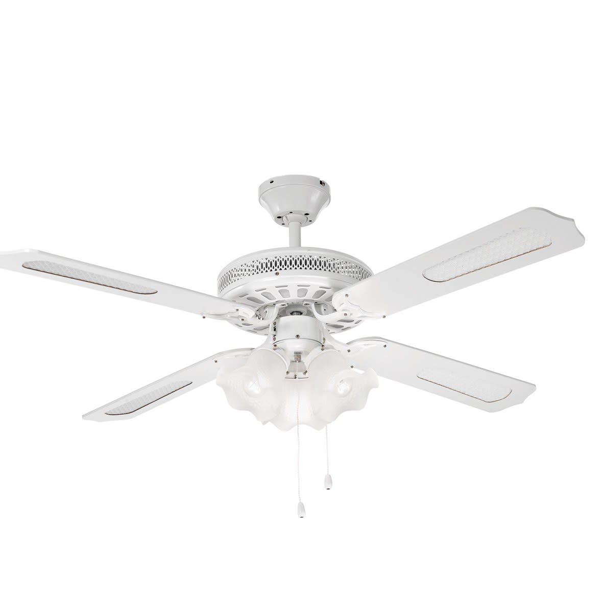 Ventilatore a soffitto dallo stile classico a quat tro pale in legno con inserti in paglia di Viennae tazze portalampada in vetro. Proposto in finitura bianca. Dotato di invertitore di marcia estate-inverno. Predisposto per telecomando a infrarossi da acquistare separatamente (cod.7570) o accensione e regolazione della velocit? tramite corda tirett o.