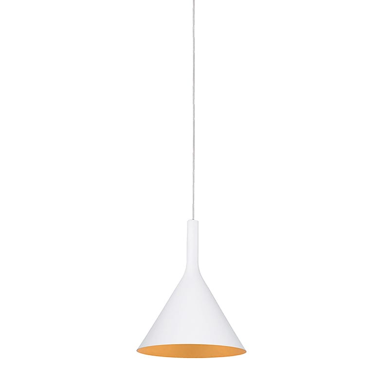 Lampada a sospensione a forma conica in metallo verniciato a polveri, progettata in due differenti misure, in finitura bianca o nera, con interno bianco o oro satinato. Disponibile in versione singola (cavo di sospensione nero o trasparente), con kit decentramento a tre o cinque elementi (cavo in tinta con il corpo lampada) o con possibilit? di decentramento dal punto luce. Soluzione disponibile a nche per binario SQUASH, SQUASH PRO e GROOVE EVO.Attacco E27 che consente di montare lampadina LED.
