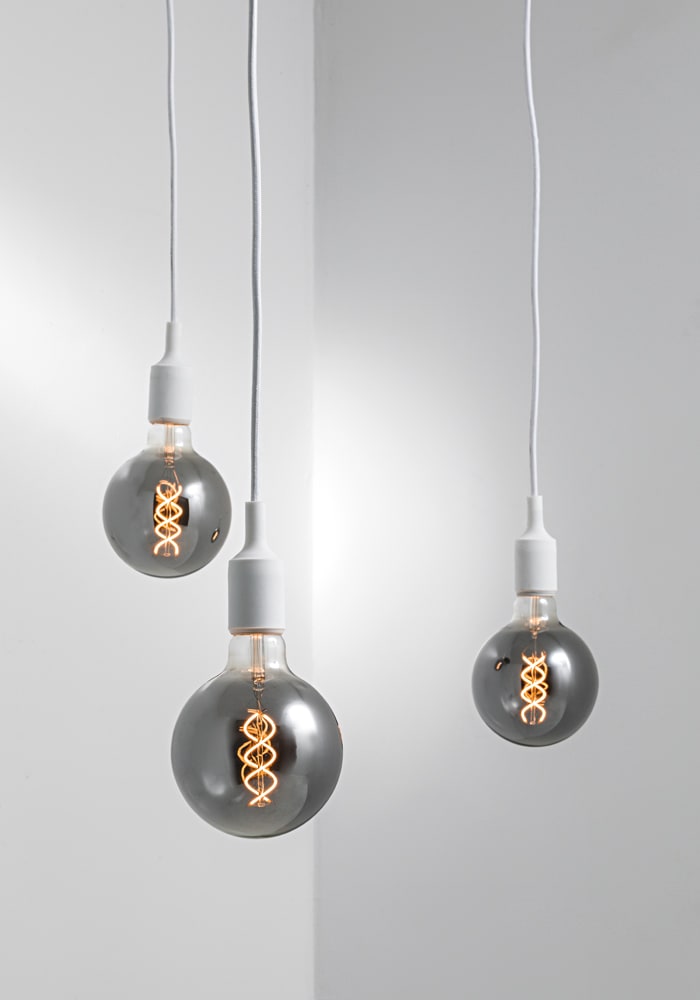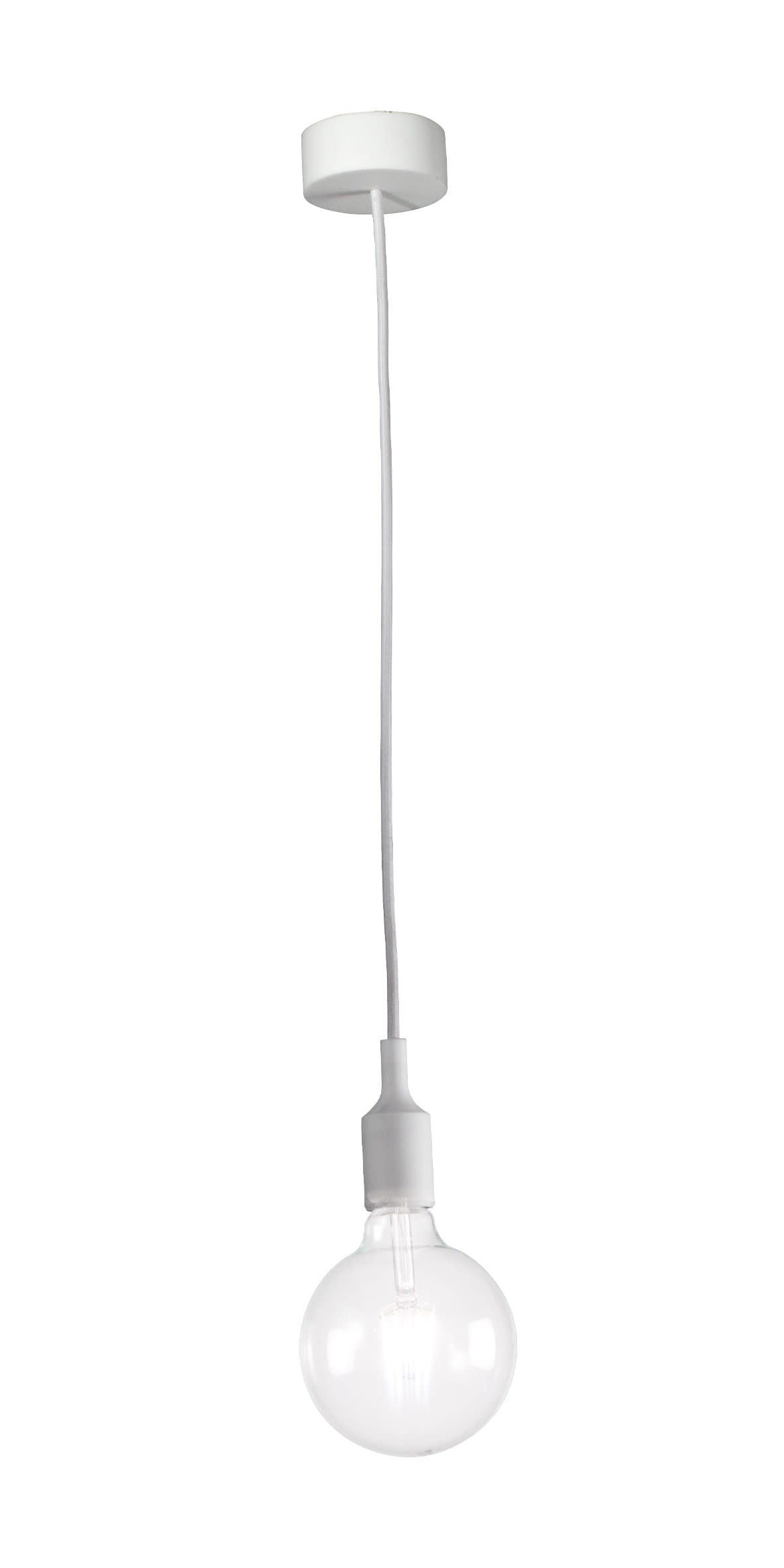 Lampada a sospensione singola con portalampada insilicone e cavo in tessuto, in tinta con la struttura e il rosone. Proposta nelle finiture bianca, nera, grigia, rossa e gialla. Attacco E27 con lampadina a vista, che consente all'utente di montare una lampadina a sua scelta, personalizzando ulterio rmente il prodotto.