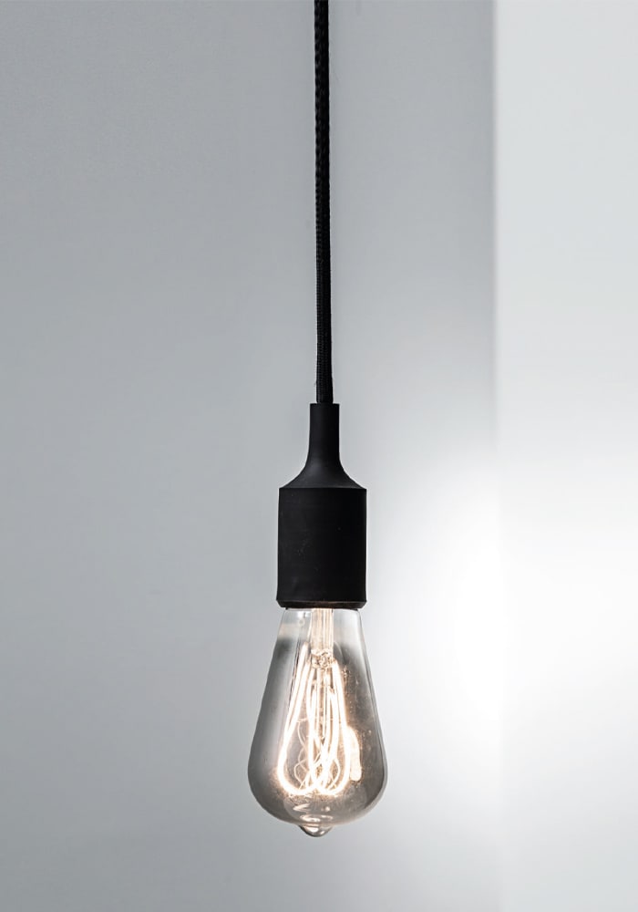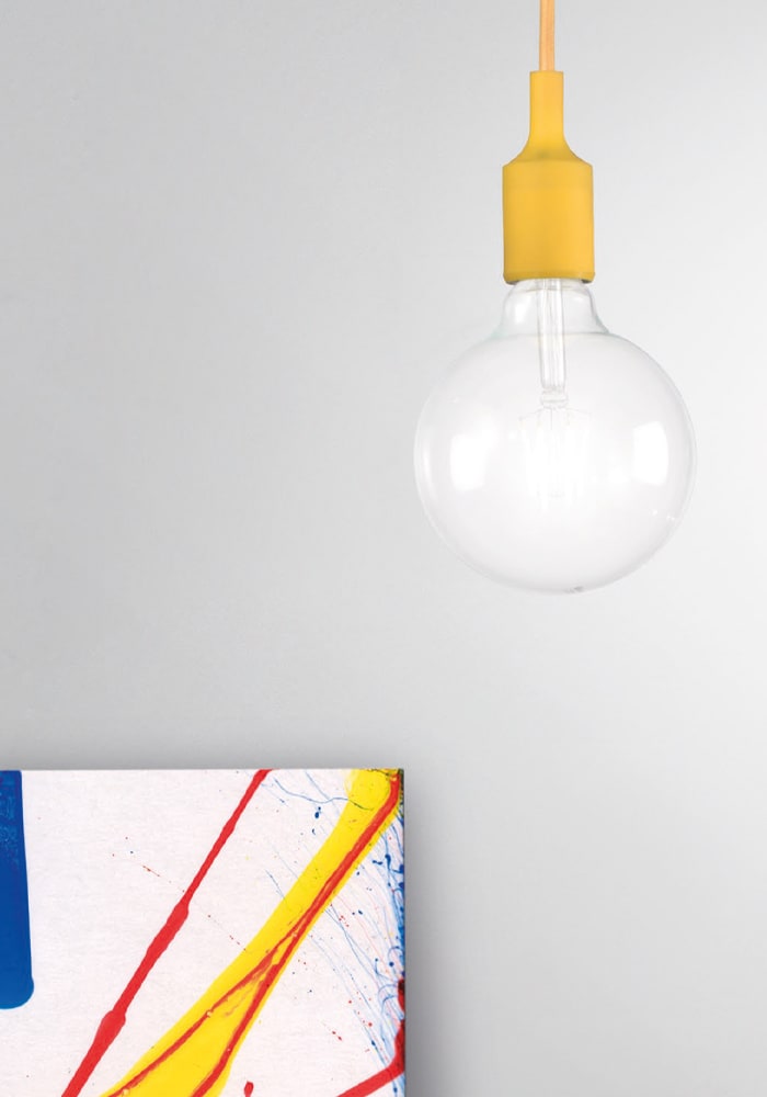Lampada a sospensione singola con portalampada insilicone e cavo in tessuto, in tinta con la struttura e il rosone. Proposta nelle finiture bianca, nera, grigia, rossa e gialla. Attacco E27 con lampadina a vista, che consente all'utente di montare una lampadina a sua scelta, personalizzando ulterio rmente il prodotto.