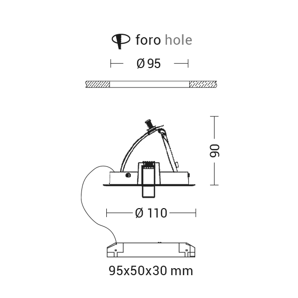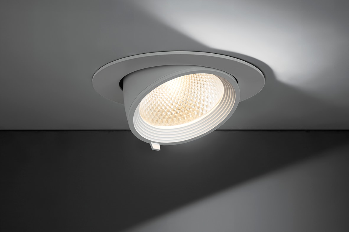 Faretto con LED COB ad incasso, estraibile, cardanico, orientabile di 90? rispetto all'asse orizzontale e di 358? rispetto all'asse verticale. Struttura in alluminio verniciato bianco, diffusore in vetro. Disponibile in tre dimensioni e relative potenze e due temperature colore (3000K e 4000K). Corredato di alimentatore LED da installare in remoto.