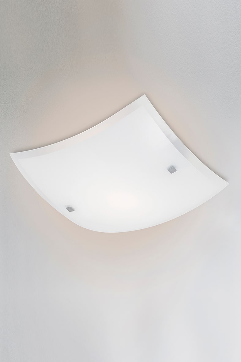 Lampada da parete e a soffitto in vetro curvato bi anco satinato. Struttura e particolari in metallocromato. Attacco E27 che consente di montare lampa dina LED.
