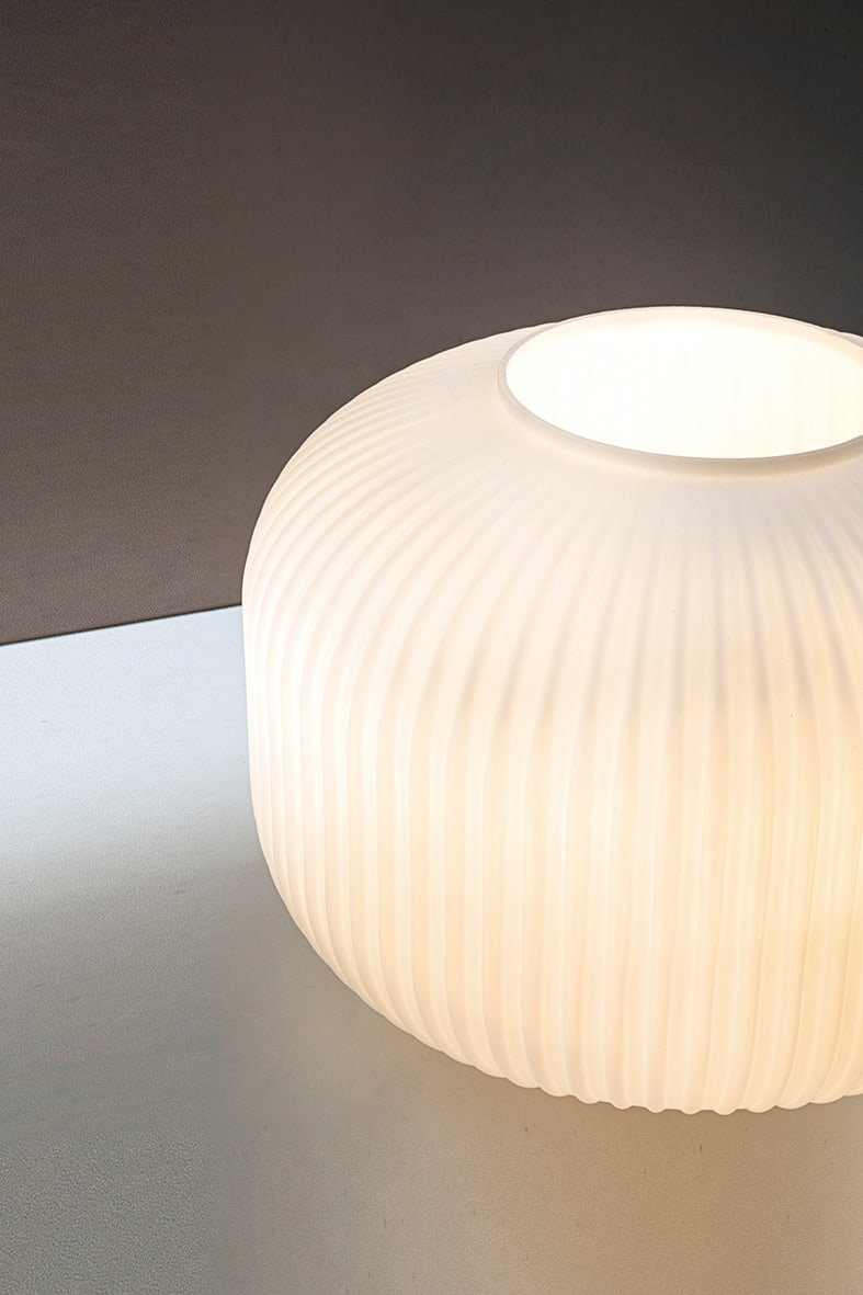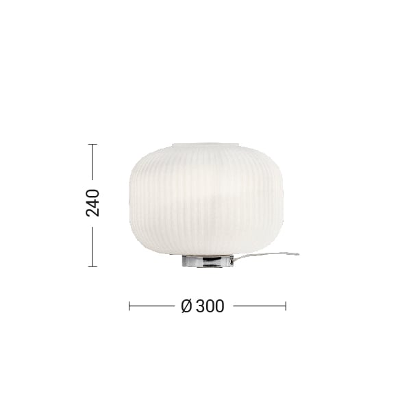 Lampada da soffitto, a sospensione e da tavolo dal design semplice: struttura cromata e diffusore in vetro bianco satinato con pliss? geometrico ripro dotto sulla superficie che offre una luce diffusae confortevole. Attacco E27 che consente di montar e lampadina a LED.