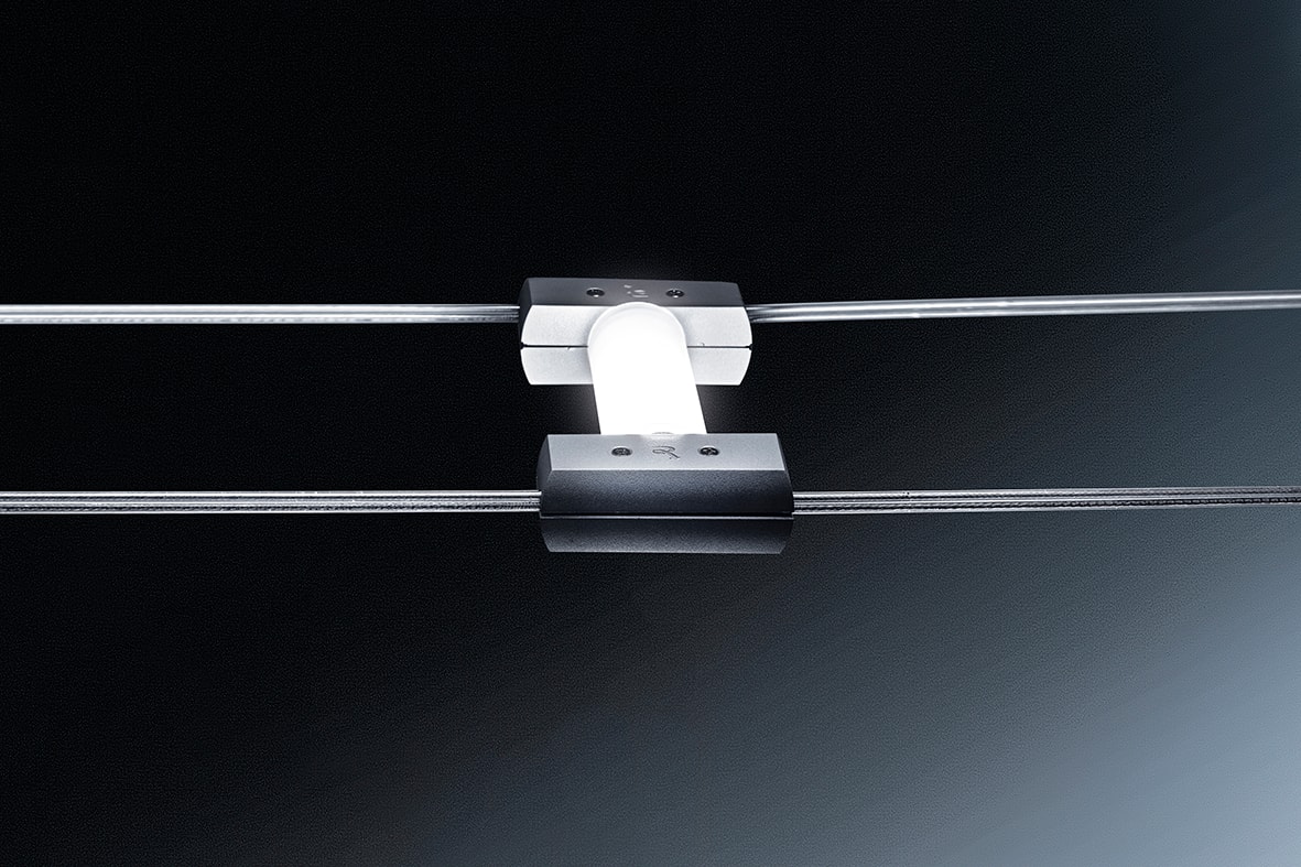 Sistema a tesata con coppia di cavi con interasse160mm: permette di installare apparecchi con fonte luminosa con LED integrato o con attacco tradizionale (GU10, R7s, E27 che consentono di montare lampadina LED). Corpi illuminanti da posizionare secondo le esigenze di installazione in estruso di all uminio (verniciato bianco opaco o grigio opaco) ediffusore in policarbonato. Disponibili in versione luce diffusa, monoemissione o biemissione o a sp ot con corpo illuminante orientabile su due assi.LED disponibile in due gradazioni (3000K e 4000K).