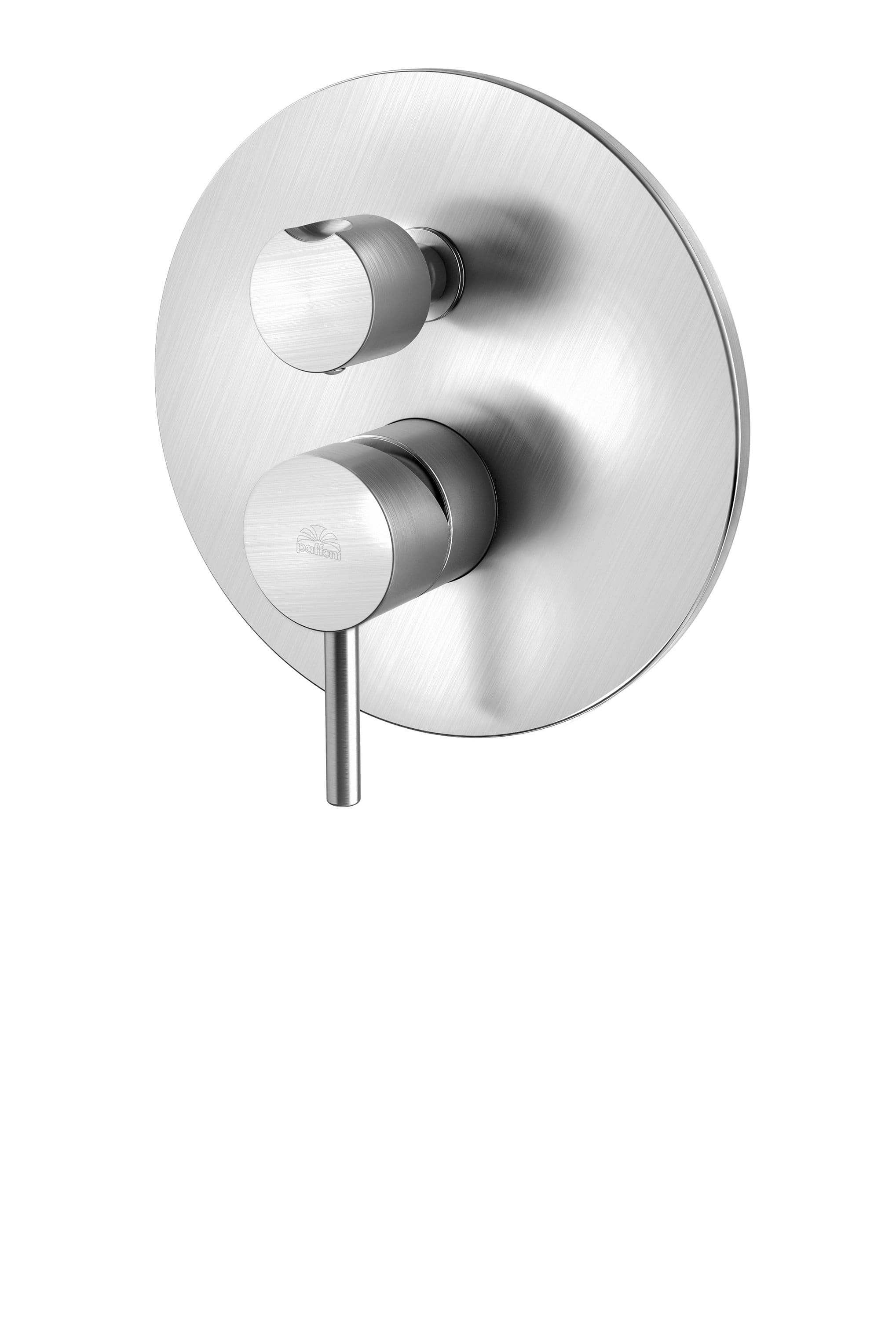 Miscelatore incasso doccia (2 uscite) con cartuccia deviatore (2 uscite + 1 posizione combinata), completo di: • piastra in metallo Ø200mm • attacchi 1/2”G. Finitura Steel looking