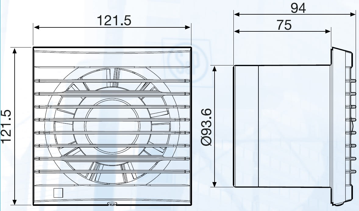 Ventilatori elicoidali con portata di circa 80 m3/h, motore 230V 50Hz, Classe II, IP44*, con protezione termica per temperatura di esercizio fino a 40°C. con Raddrizzatori di flusso