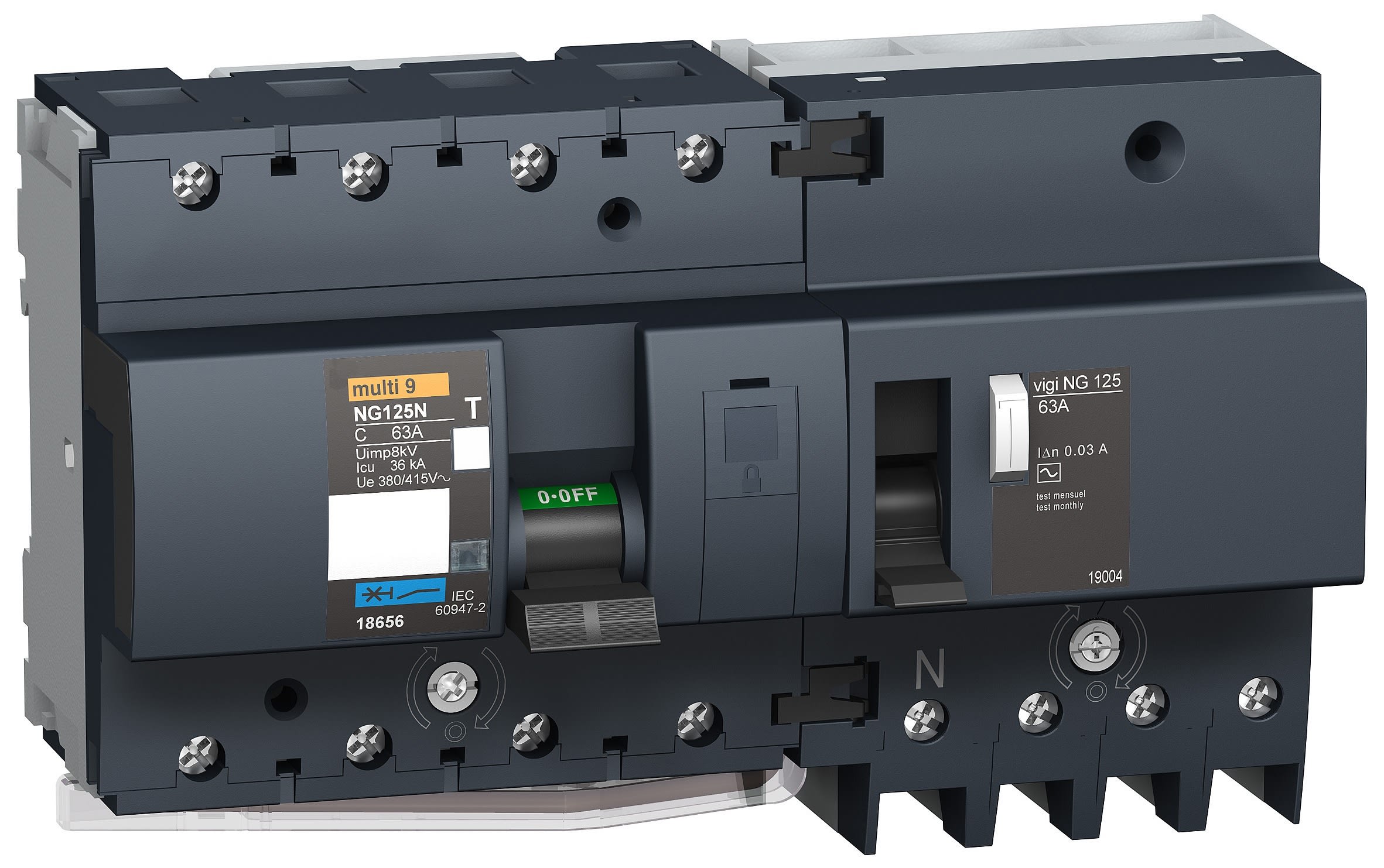 VigiNG125 è un dispositivo modulare aggiuntivo a corrente residua. Ha 4P e corrente nominale di 63A. La classe di protezione da dispersione a terra è di tipo AC con una sensibilità di 300 mA e una tecnologia indipendente dalla tensione. Questo prodotto protegge da cortocircuiti, sovraccarichi di cavi, scosse elettriche da contatti indiretti e pericoli di incendio. Questo dispositivo è combinato con un interruttore NG125 per fornire la protezione da dispersione a terra e la protezione da circuito. Questo prodotto è conforme alla norma IEC 60947-2. La tensione di esercizio nominale Ue è compresa tra 230VAC e 415 V AC. La tensione nominale di isolamento Ui è 690 V AC. La tensione nominale di tenuta ad impulso Uimp è 8 kV. Il grado di inquinamento è 3. Può essere montato su guida DIN simmetrica da 35 mm. Larghezza in passi da 9 mm è 9. Le dimensioni totali sono (H) 189 mm x (L) 118 mm x (P) 81 mm. Il peso è 0,45 kg. Il grado di protezione è IP20 e IP40 in un armadio.
