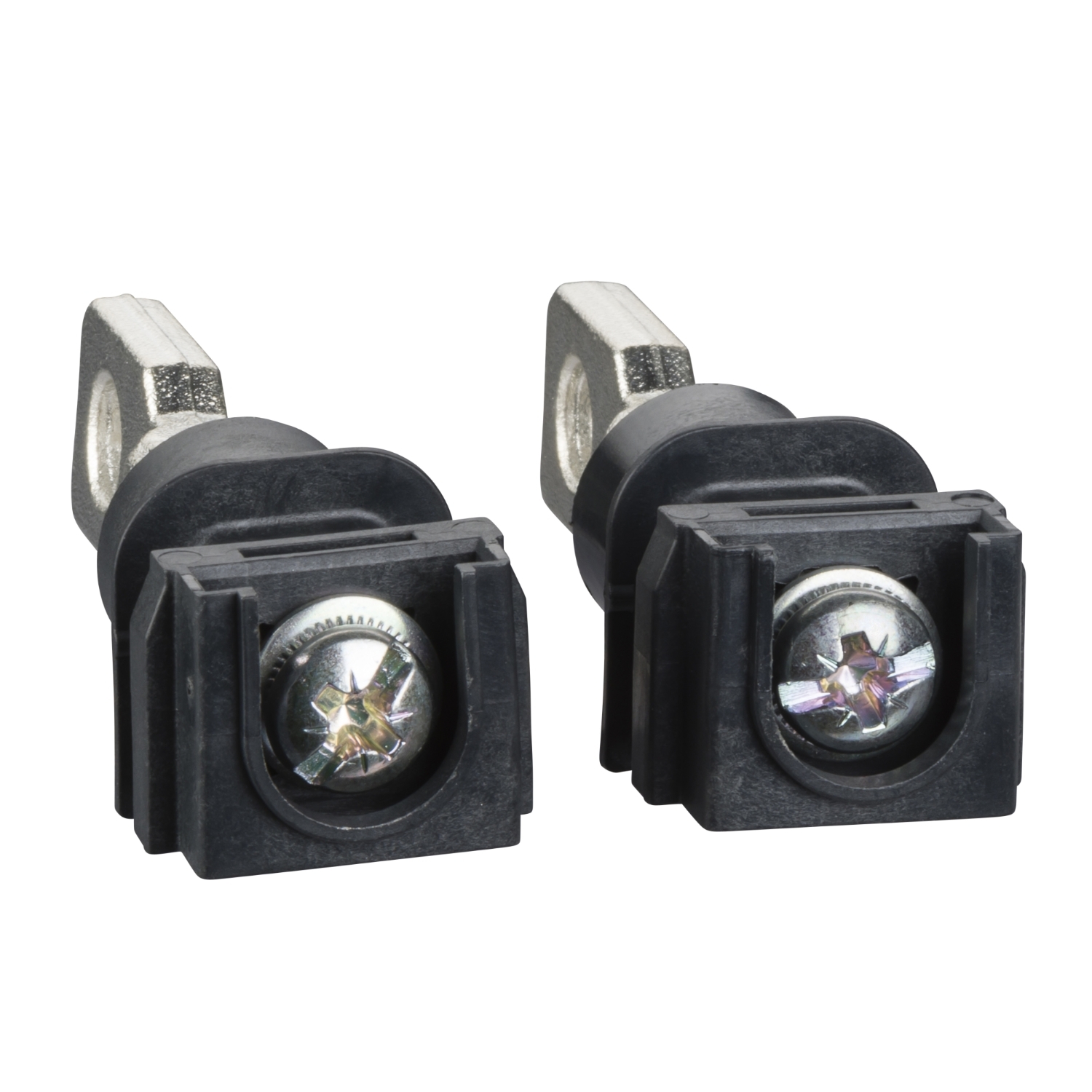 Attacchi posteriori corti per Compact NSX 100/160/250 e EasyPact CVS 100/160/250. Il collegamento posteriore è semplicemente montato sui morsetti di collegamento del dispositivo. Il montaggio del dispositivo su una piastra posteriore con fori adeguati consente il collegamento posteriore. La lunghezza è di circa 43 mm. La corrente nominale è fino a 250 A. Sono venduti in set da 2 pezzi.