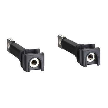 Attacchi posteriori corti per Compact NSX 100/160/250 e EasyPact CVS 100/160/250. Il collegamento posteriore è semplicemente montato sui morsetti di collegamento del dispositivo. Il montaggio del dispositivo su una piastra posteriore con fori adeguati consente il collegamento posteriore. La lunghezza è di circa 88 mm. La corrente nominale è fino a 250 A. Sono venduti in set da 2 pezzi.