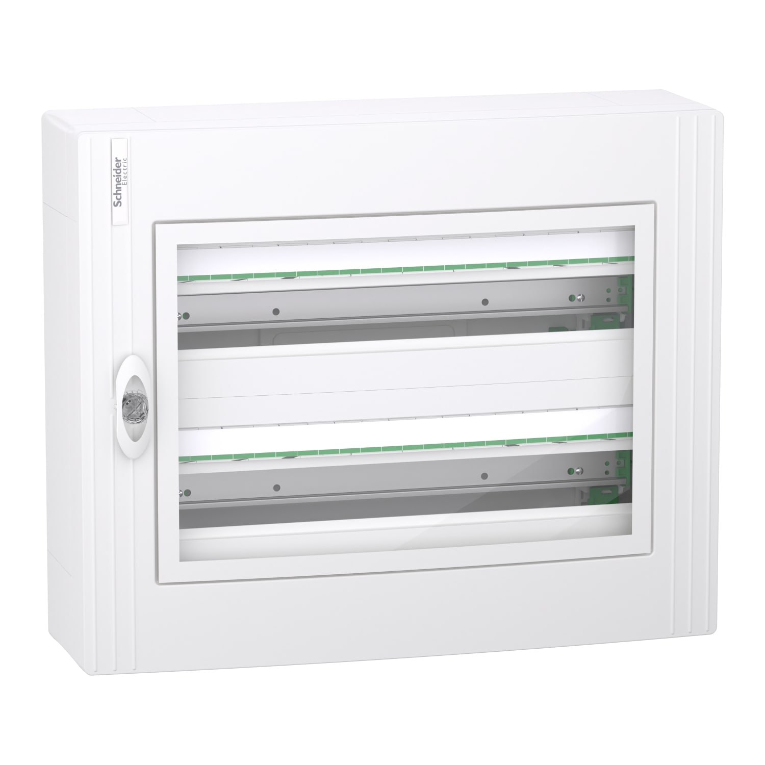 This PrismaSeT XS enclosure is a surface mounted distribution enclosure. This metal and plastic enclosure is composed of 2 rows of 24 modules of 18mm. It can accomodate all types of modular switchgear. This enclosure is dedicated to indoor installation. The IP degree of protection is IP40 closed door. It is provided with a transparent colourless door. The colour of the enclosure and the front plate is white (RAL 9003). This ready-to-use enclosure is intended in residental and tertiary sectors. It is devised for electricians, providing ergonomics and flexibility of installation. The cables can enter via the top or bottom of the enclosure by removable cable entry plates. It enables entry by cable, tube or trunking. It is equipped with 1 back plate and 2 DIN rails. The rails are removable and facilitate wiring and maintenance operations. It comes with 1 earth terminal block. This terminal block provides 24 outgoers (3x25mm²+21x4mm²). It can also accommodate a vertical Acti9 VDIS distributor 24 modules size.It is provided with 1 identification label, 1 label protector, 1 blanking plate strip and some cable fixing hardware. The electrical insulation class is class II. The Ui rated insulation voltage is 400V. The overvoltage category is II. The In rated current is up to 125A. It complies with IEC 60670-1 and 24, IEC 61439-1 and 3 standards. The total dimensions are (W) 550mm x (H) 450mm x (D) 168mm. The product weight is 10.270kg. The enclosure and the front plate are made of technoplastic. The back part s made of metal. the door is made of glass. The resistance of the plastic to flames and to abnormal heat is 650°C for enclosure and front plate. The IK degree of protection is IK09 closed door. The operating temperature are -25°C to 60°C.