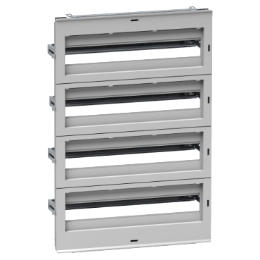 Telaio di distribuzione modulare. 86 moduli (18 mm). 4 Righe orizzontali. Struttura telaio e guide in acciaio, pannello frontale isolante autoestinguente. 1 struttura telaio, 4 pannelli frontali con guida DIN da 35 mm, 2 coperchi di finitura. 1 striscia terra/neutro 2 x 16 mm² 5 x 6 mm² inclusa. Per NSYPLM75, NSYS3D75, NSYCRN75, NSYS3X75.
