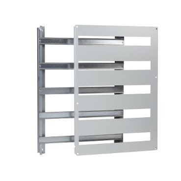 Telaio DL per armadi Spacial S3X e Spacial CRN Il telaio deve essere fissato sulla parte anteriore dell'armadio mediante elementi di fissaggio - sul retro con posizione dei supporti La larghezza è di 255 mm L'altezza è di 355 mm La profondità è di 110 mmIl numero di moduli da 18 mm è 24 (1 modulo = 2 passi = 18 mm) Il numero di file orizzontali è 2 La profondità dello chassis può essere regolata in altezza da 40 a 85 mm per la guida DIN Il prodotto è realizzato in acciaio grigio (RAL 7035) La parte anteriore è di colore grigio (RAL 7035) Il numero di aperture è 2 Il kit è costituito da 1 struttura di telaio, 1 striscia neutro/terra 2 x 16 mm² 5 x 6 mm², 1 pannello frontale e 2 guide DIN da 35 mm La protezione anticorrosione è assicurata da un rivestimento in polvere di poliestere