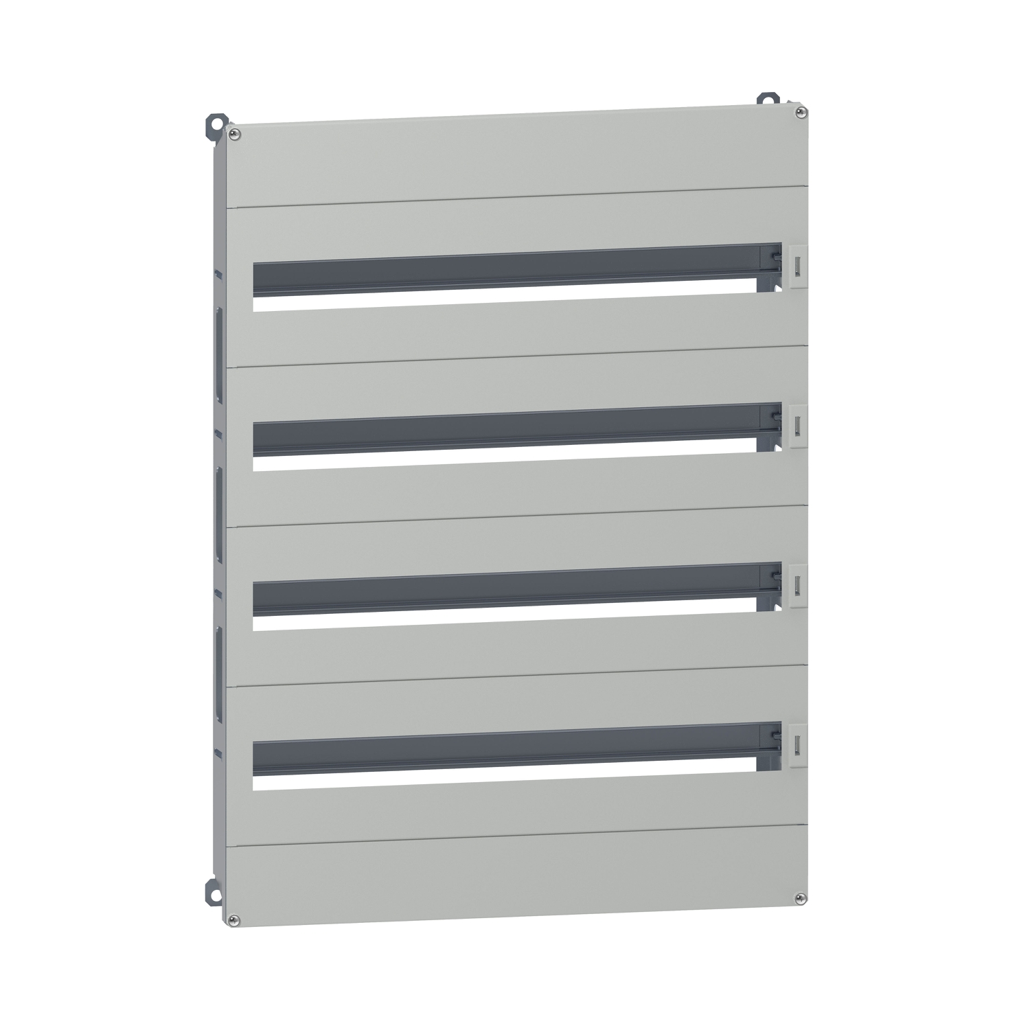 Telaio modulare DLM per cassette PanelSeT con montaggio a parete. A 800 x L 600 mm, 112 moduli (18 mm). Applicazione di distribuzione modulare multifunzione. Guida scorrevole, lato frontale della cassetta. Regolazione in altezza da 40 a 85 mm per la guida DIN. In acciaio. Grigio RAL 7035. 2 coperchi di finitura, 1 striscia di neutro/terra 2 x 16 mm² 5 x 6 mm², 3 pannelli frontali (guida DIN 35 mm).