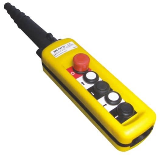 La pulsantiera pensile gialla Harmony XAC di Schneider Electric per motori di sollevamento ha 1 velocità. Dispone di 1 pulsante "salita" + 1 pulsante "discesa" + 1 pulsante "destra" + 1 pulsante "sinistra" + 1 pulsante di arresto d'emergenza e utilizza morsetti a vite. Questa pulsantiera pensile per motori di sollevamento è progettata per applicazioni di circuiti di comando standard o di media potenza nelle macchine. Dispone di 4 pulsanti e 1 arresto di emergenza con marcature "salita", "discesa", "destra" e "sinistra" con contatto normalmente aperto e normalmente chiuso. Grazie al suo grado di protezione IP65, è resistente agli urti e alle vibrazioni, è protetto contro la polvere e la penetrazione di liquidi, ed è ideale per l'uso in ambienti gravosi.