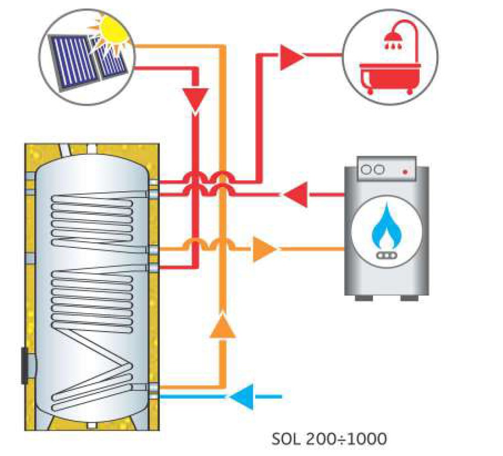 BOLLITORE SOLARE A DOPPIO SERPENTINO SPIROIDALE I prodotti della serie SOL sono bollitori per la produzione e l‘accumulo di acqua calda sanitaria. Il doppio scambiatore permette di utilizzare, oltre la caldaia tradizionale, una fonte di energia alternativa quale il solare ma non solo. Lo scambiatore inferiore si sviluppa fino alla parte piu bassa dell‘bollitore riscaldando così una maggior quantità d‘acqua