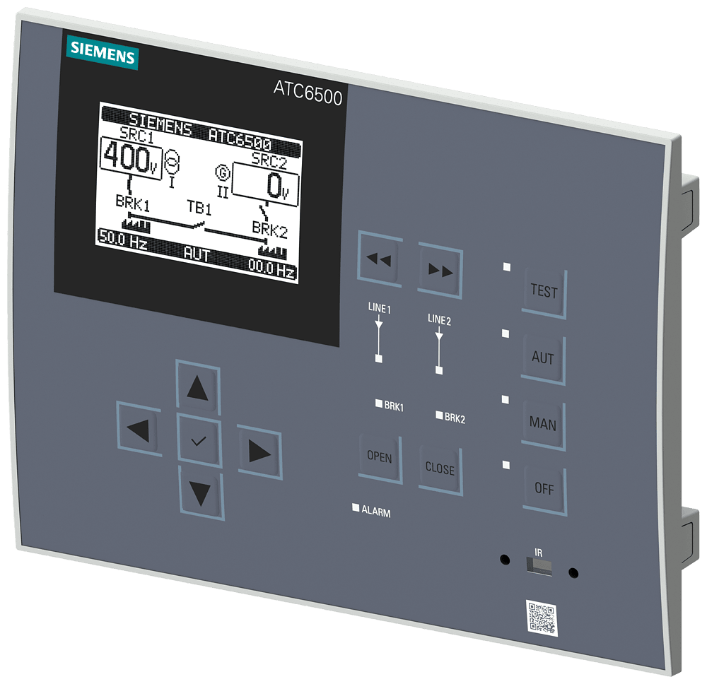SENTRON 3KC ATC6500; LCD;180x240 mm; commutatore automatico di rete per comando di MCCB, ACB, per trasferimento del carico tra rete principale e rete di riserva; il comando aggiuntivo di un interruttore di accoppiamento è possibile; apparecchio da incasso nel pannello di comando: Un: AC 100 ... 240 V 50/60 Hz DC 110 ... 250 V; Un: DC 12 ... 48 V, tensione nominale Ue: AC 100 ... 600 V 50/60 Hz; collegamento con morsetti a vite; interfaccia RS-485 integrata, ampliabilità con max. 3 moduli aggiuntivi accessori per commutatore di rete SENTRON 3KC9 per unelevata flessibilità. Grazie a unampia gamma di accessori, i commutatori di rete possono essere utilizzati per diverse esigenze ed essere installati successivamente in qualsiasi momento. Sicurezza integrale per utenti e sistemi.