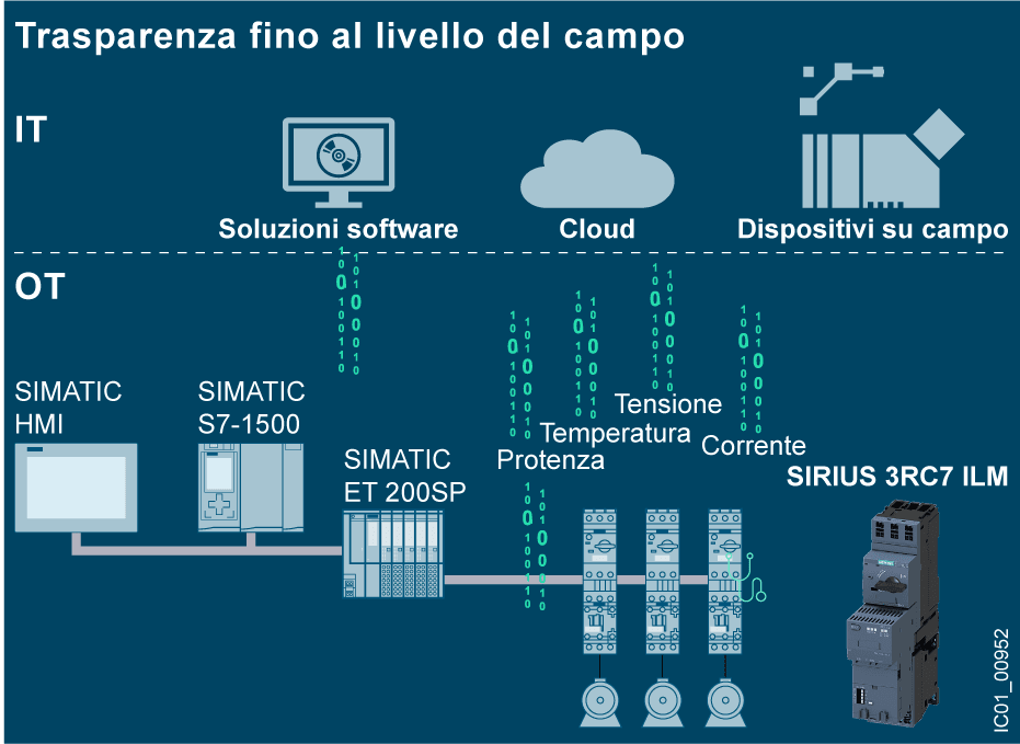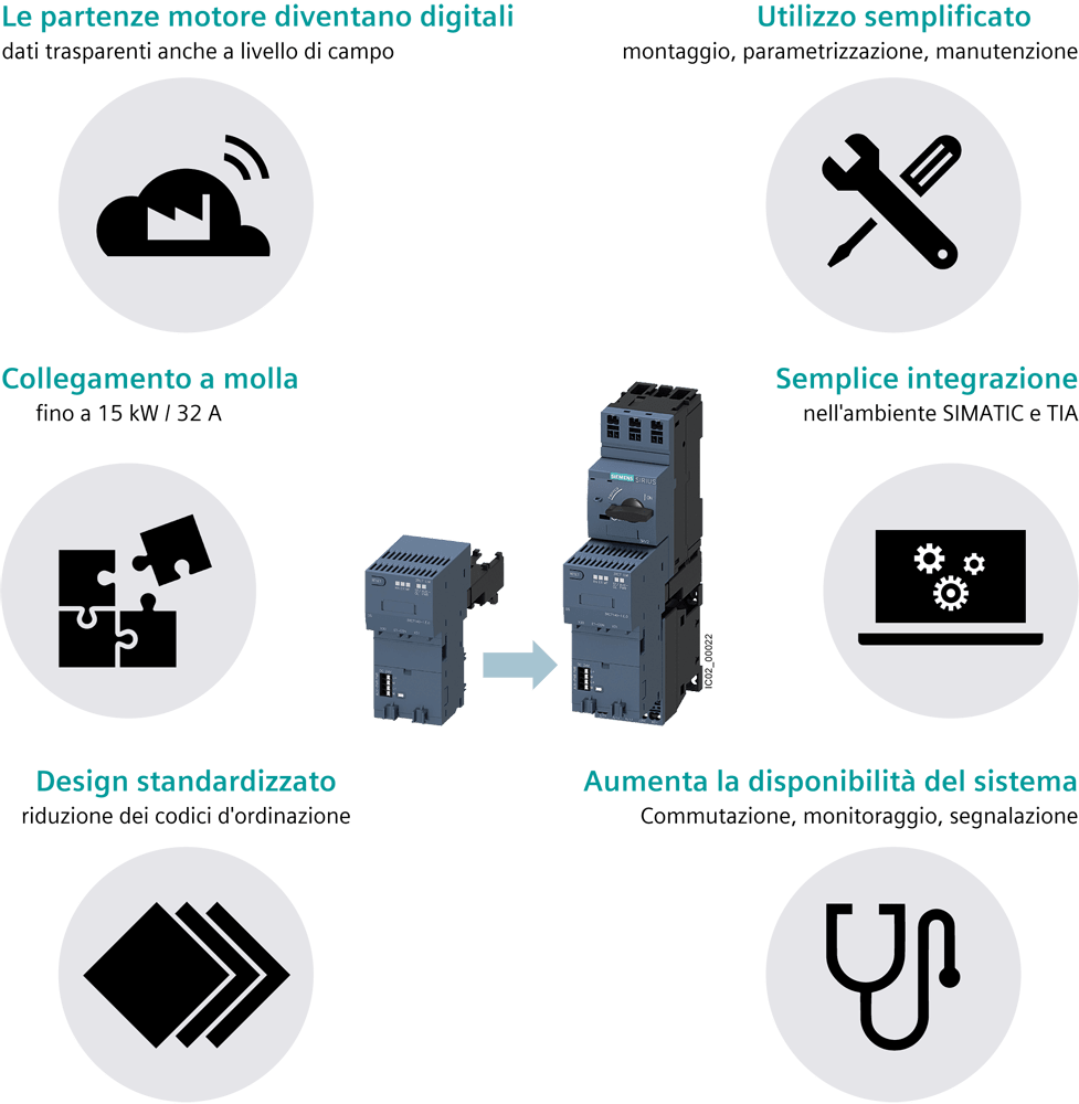modulo Link intelligente avviatore diretto High Feature 3,5 ... 32 A fino a AC 690 V grandezza costruttiva S0 per 3RV2.2 e 3RT2.2 per sistema ET 200SP Modulo link intelligente SIRIUS 3RC7 come estensione plug-and-play per lintegrazione di partenze motorenel sistema di automazione SIMATIC ET 200SP. Combinate il modulo di collegamento intelligente 3RC7 con i nostri contattori e interruttori automatici per realizzare una partenza motore intelligente. Essendo un componente del comprovato concetto di automazione Totally Integrated Automation (TIA) di Siemens, esso è perfettamente integrato nellambiente di automazione esistente. Il rilevamento diretto di valori di misura e informazioni di stato consente la trasparenza fino nel livello di campo. La funzione disovraccarico integrata e il riconoscimento di guasti, deviazioni e manutenzione necessaria facilitano la diagnostica e consentono una manutenzione preventiva. La notevole riduzione dellonere di cablaggio, la semplicità di montaggio nel quadro elettrico ela parametrizzazione in TIA Portal consentono di risparmiare tempo durante la messa in servizio e gli ampliamenti. I moduli di collegamento intelligente 3RC7 sono disponibili per avviatori diretti e avviatori invertitori per diversi campi di corrente, come varianti sia Standard che High Feature e tra laltro con misura della tensione e della potenza. Come accessori sono disponibili ad es. adattatori per montaggio separato, Power Cable e Communication Cable. Moduli di collegamento intelligenti 3RC7 - Semplicemente digitali. Intelligenti sotto vari aspetti.