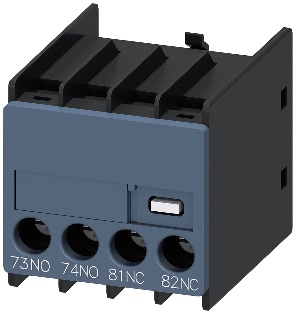 blocchetto di contatti ausiliari, sul lato frontale, 1 NO + 1 NC, 73/74, 81/82, via di corrente: 1 NO, 1 NC, ingresso cavi dal basso, morsetti a vite, per contattori 3RT2 e contattori ausiliari 3RH2 contatto ausiliario SIRIUS 3RH29 per lampliamento dei contatti ausiliari nel circuito di comando. I blocchetti di contatti ausiliari frontali 3RH29 possono essere montati senza attrezzi indipendentemente dalla grandezza costruttiva sui contattori 3RT2 e sui contattori ausiliari 3RH2. I blocchetti di contatti ausiliari 3RH19/3RH29 sono fornibili come varianti per il montaggio frontale o laterale, con fino a quattro contatti NO con commutazione istantanea o fino a due contatti NO e NC anticipati. I blocchetti di contatti ausiliari possono essere in esecuzione con elementi di contatto a guida forzata in contattori ausiliari 3RH o anche come contatti speculari in contattori di potenza 3RT. Essi sono sempre fornibili con morsetti a vite e morsetti a molla. Semplice, efficiente, sempre attuale - il sistema modulareSIRIUS.