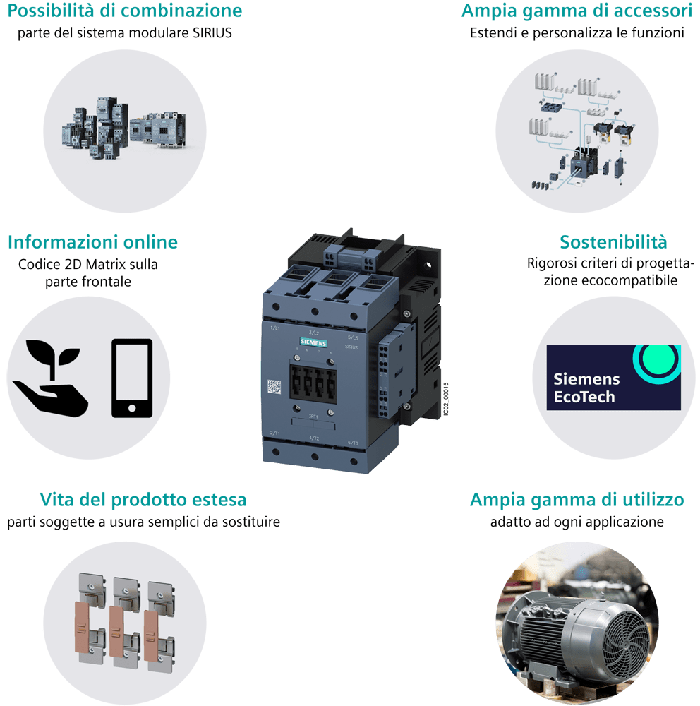 contattore di potenza, AC-3e/AC-3 115 A, 55 kW / 400 V, AC (50 ... 60 Hz) / DC Uc: 220 ... 240 V a 3 poli, contatti ausiliari 2 NO + 2 NC azionamento: convenzionale circuito princ.: sbarra circuito di comando e circuito ausiliario: morsetti a molla Contattore di potenza SIRIUS 3RT1 per il comando di motori. I contattori 3RT1 sono parte integrante del sistema componibile SIRIUS con i suoi prodotti perfettamente accordati tra di loro. Essi convincono per la grande potenza in una forma costruttiva compatta e lelevata affidabilità di contatto. Sono combinabili in diversi modi con altri componenti nella partenza. I contattori offrono per ogni applicazione il collegamento ottimale al controllore (diretto o tramite ingresso di PLC). I blocchetti di contatti ausiliari integrati riducono la complessità del montaggio. I contattori 3RT1 sono tropicalizzati, con omologazioni internazionali (ad es. IEC e UL/CSA) e IE3/IE4ready. Essi sono disponibili in diverse grandezze costruttive e con un ampio campo di potenza. Essi possono essere comandati in AC o DC, alcune varianti hanno un ampio campo di tensione e un ingresso di comando da PLC. Nel circuito principale è possibile collegare gli apparecchi tramite sbarre o morsetti serracavo. Per il circuito ausiliario e di comando essi sono disponibili anche con morsetti a molla per un collegamento rapido, esente da manutenzione e resistente a urti. Per questi contattori sono disponibili numerosi accessori, come ad es. kit di cablaggio, che riducono notevolmente lonere di cablaggio, blocchetti di contatti ausiliari o calotte coprimorsetti. Semplice, efficiente, sempre attuale - il sistema modulare SIRIUS.