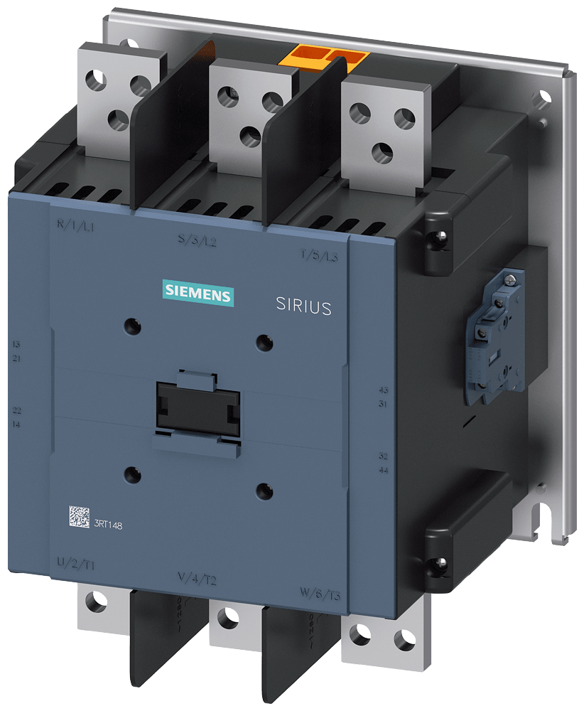 contattore di potenza AC-1 1260A / 690 V / 40°C a 3 poli, Uc: AC 100 ... 240 V(50 ... 60 Hz) / DC 100 ... 220 V, comando: convenzionale contatti ausiliari 2 NO + 2 NC circuito princ.: sbarra circuito di comando e circuito ausiliario: morsetti a vite Contattore SIRIUS 3RT14 per il comando di utilizzatori debolmente induttivi o non induttivi. I contattori 3RT1 sono parte integrante del sistema componibile SIRIUS con i suoi prodotti perfettamente accordati tra loro. Essi convincono per la grande potenza in una forma costruttiva compatta e lelevata affidabilità di contatto. È possibile combinarli in modo molteplice con altri componenti nella partenza. I contattori offrono per ogni applicazione il collegamento ottimale al controllore (diretto o tramite ingresso di PLC). I blocchetti di contatti ausiliari premontati riducono la complessità del loro montaggio. I contattori 3RT1 sono tropicalizzati e hanno omologazioni internazionali (ad es. IEC e UL/CSA). Semplice, efficiente, sempre attuale - il sistema modulare SIRIUS.