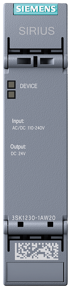 dispositivo di sicurezza SIRIUS alimentazione di corrente per 3SK1 serie Advanced Us = AC/DC 110-240 V morsetto a vite Alimentatore SIRIUS 3SK1 per lalimentazione dei moduli di base Advanced. Lalimentatore 3SK1230 consente limpiego universale dei moduli 3SK1 indipendentemente dalla tensione di alimentazione di comando presente con AC/DC 110-240 V. Il collegamento può avvenire tramite i connettori di apparecchiatura 3ZY1212. Gli apparecchi sono sempre fornibili con morsetti a vite o a molla (push-in). I dispositivi di sicurezza 3SK sostituiscono la comprovata serie costruttiva 3TK28. Safety is a SIRIUS business.