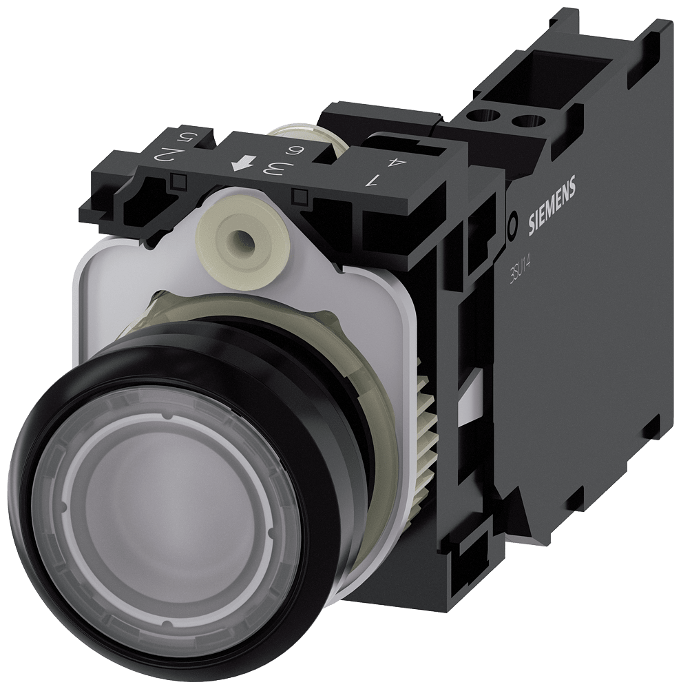 pulsante luminoso, 22 mm, rotondo, in plastica, trasparente, bottone, piatto, ad impulso, con supporto, 1 NO+1 NC, modulo LED con LED integrato AC 110 V, morsetto a molla Pulsanti luminosi SIRIUS ACT per la commutazione e il comando di utilizzatori elettrici. Siemens offre, sotto il nome commerciale SIRIUS ACT, un portfolio esclusivo di dispositivi di comando e segnalazione con omologazioni di prodotto per il mercato mondiale in tre moderne serie di design in robusto metallo puro e plastica pregiata.Linnovativo concetto di innesto a scatto semplifica talmente il montaggio che per eseguirlo basta una sola mano e non servono attrezzi speciali. Per i fori di montaggio sono sufficienti semplici fori non scanalati, essendo già integrata una protezione antirotazione al 100 %.Grazie al grado di protezione elevato i robusti apparecchi sono adatti allimpiego industriale e in ambiente esterno. È persino possibile la pulizia con getto ad alta pressione. Né polvere, né oli, né liscivia possono comprometterne il funzionamento affidabile.Oltre che con il cablaggio standard, gli apparecchi possono essere collegati al controllore anche tramite PROFINET, AS-Interface oppure IO-Link. Potete così ridurre il vostro onere di cablaggio, minimizzare le fonti di errore e ottenere maggiore flessibilità.Il configuratore online grafico supporta in modo confortevole la scelta e lordinazione di singoli apparecchi, pulsantiere e iscrizioni. È disponibile una documentazione completa (ad es. manuale, dati 3D, schema di collegamento). Esecuzioni fornibili: più colori, luminoso/non luminoso, con/senza iscrizione, comando permanente/ad impulso, diverse altezze di bottone e ghiera. Avvertenza: Apparecchio completo, fornitura incl. supporto e moduli. SIRIUS ACT - Performance in Action nel comando e nella segnalazione. Semplici da montare, altamente performanti, semplicemente perfetti.