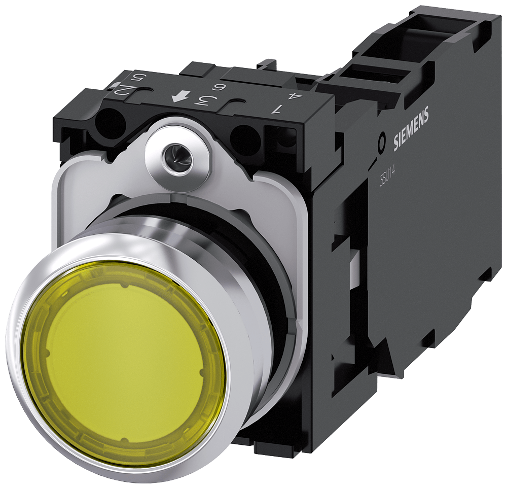 pulsante luminoso, 22 mm, rotondo, in metallo, lucido, giallo, bottone, piatto, ad impulso, con supporto, 1 NO+1 NC, modulo LED con LED integrato AC 110 V, morsetto a vite Pulsanti luminosi SIRIUS ACT per la commutazione e il comando di utilizzatori elettrici. Siemens offre, sotto il nome commerciale SIRIUS ACT, un portfolio esclusivo di dispositivi di comando e segnalazione con omologazioni di prodotto per il mercato mondiale in tre moderne serie di design in robusto metallo puro e plastica pregiata.Linnovativo concetto di innesto a scatto semplifica talmente il montaggio che per eseguirlo basta una sola mano e non servono attrezzi speciali. Per i fori di montaggio sono sufficienti semplici fori non scanalati, essendo già integrata una protezione antirotazione al 100 %.Grazie al grado di protezione elevato i robusti apparecchi sono adatti allimpiego industriale e in ambiente esterno. È persino possibile la pulizia con getto ad alta pressione. Né polvere, né oli, né liscivia possono comprometterne il funzionamento affidabile.Oltre che con il cablaggio standard, gli apparecchi possono essere collegati al controllore anche tramite PROFINET, AS-Interface oppure IO-Link. Potete così ridurre il vostro onere di cablaggio, minimizzare le fonti di errore e ottenere maggiore flessibilità.Il configuratore online grafico supporta in modo confortevole la scelta e lordinazione di singoli apparecchi, pulsantiere e iscrizioni. È disponibile una documentazione completa (ad es. manuale, dati 3D, schema di collegamento). Esecuzioni fornibili: più colori, luminoso/non luminoso, con/senza iscrizione, comando permanente/ad impulso, diverse altezze di bottone e ghiera. Avvertenza: Apparecchio completo, fornitura incl. supporto e moduli. SIRIUS ACT - Performance in Action nel comando e nella segnalazione. Semplici da montare, altamente performanti, semplicemente perfetti.