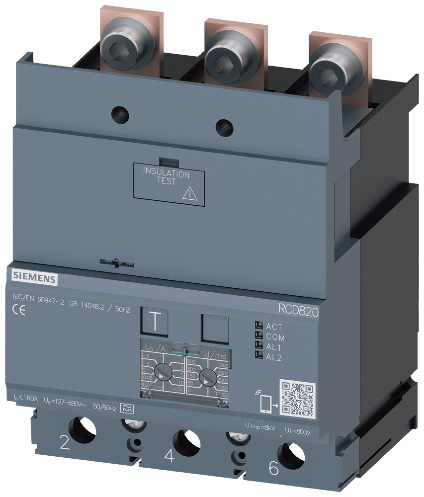 dispositivo di protezione differenziale RCD820 Advanced RCD Tipo A montato in basso corrente di guasto nominale 0,03 ... 30 A a 50/60 Hz tempo regolabile 0 ... 10000 ms a 3 poli In=160A Ue=100-690V Accessori per: 3VA2 Interruttori automatici scatolati SENTRON 3VA - un sistema. Per tutte le applicazioni.