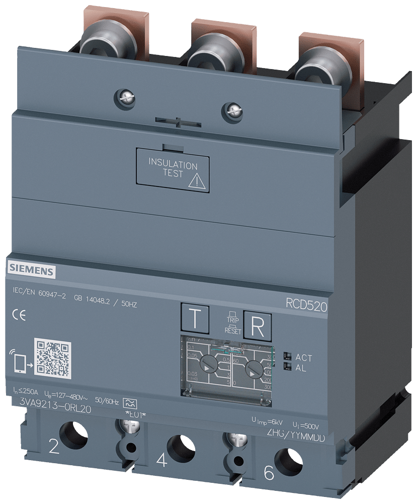 dispositivo di protezione differenziale RCD520 Basic RCD Tipo A montato in basso corrente di guasto nominale 0,03 ... 5 A a 50/60 Hz tempo regolabile 0 ... 3000 ms a 3 poli In=250A Ue=100-480V Accessori per: 3VA1 Interruttori automatici scatolati SENTRON3VA - un sistema. Per tutte le applicazioni.