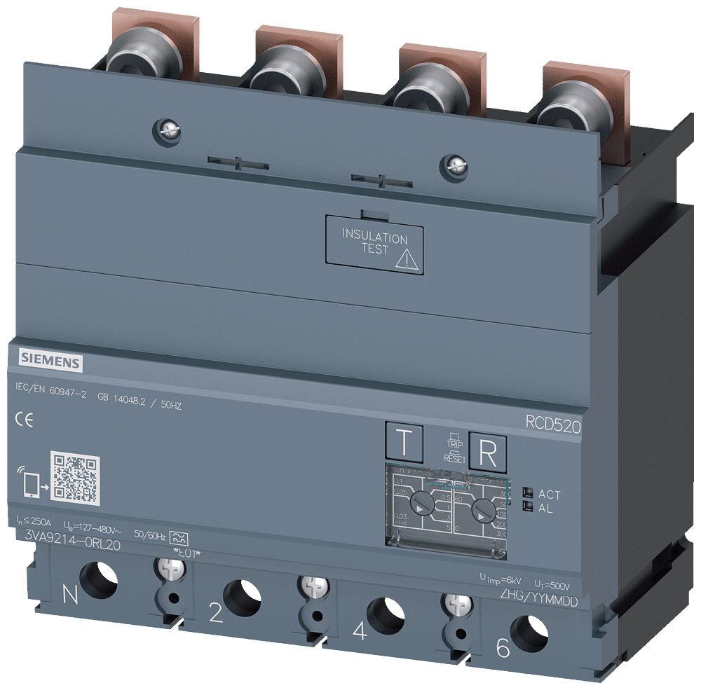dispositivo di protezione differenziale RCD520 Basic RCD Tipo A montato in basso corrente di guasto nominale 0,03 ... 5 A a 50/60 Hz tempo regolabile 0 ... 3000 ms a 4 poli In=250A Ue=100-480V Accessori per: 3VA1 Interruttori automatici scatolati SENTRON3VA - un sistema. Per tutte le applicazioni.