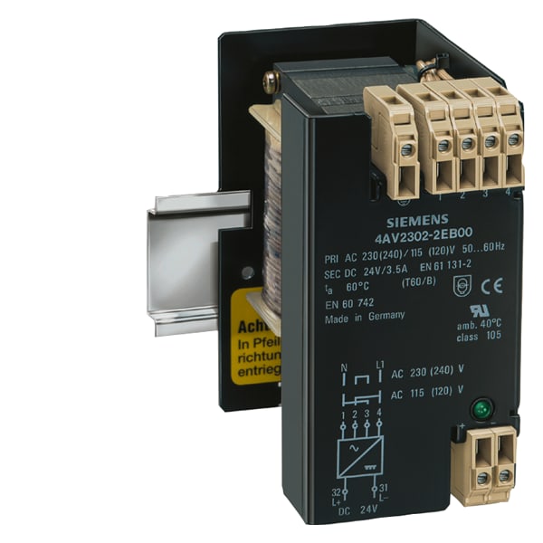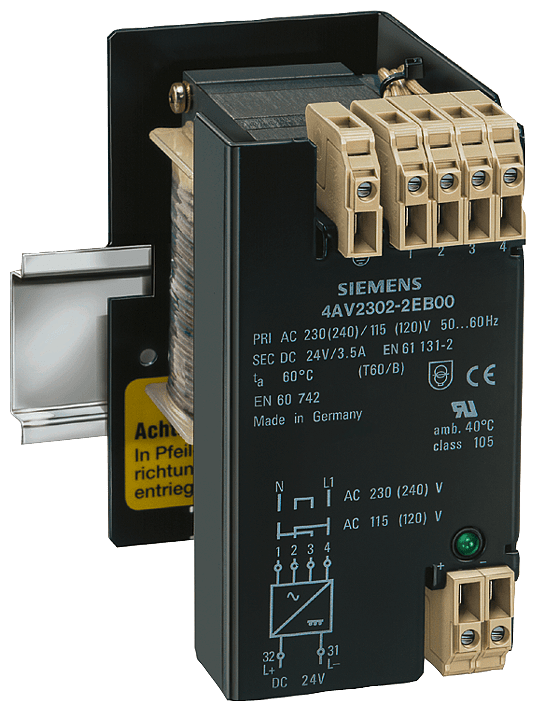 alimentazione; fasi:1; Pn(kW):0,084; Upri(V):230-115; Usec(V DC):24; Isec(A DC):3,5/4,2 (60/40 CEL); F(Hz): 50 ... 60; gruppo di collegamento/avvolgimento di schermatura: II0 /0; classe di protezione: I; TA/cl. di isolam:60 /B; W(%):5; IP00; collegamento: morsetti a vite/attacchi a spina piatta ; montaggio: guida DIN; EN 61558-2-6, EN61131-2 >trasformatore di sicurezza< Gli alimentatori 4AV forniscono una tensione continua non regolata DC 24 V sulla base di trasformatori di sicurezza monofase o trifase con raddrizzatori collegati a valle e il filtraggio con condensatori secondo la norma EN 61131-2.