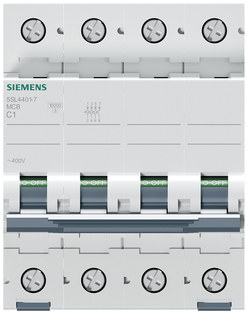 Interruttore magnetotermico 400V 10 kA, a 4 poli, C, 1A Interruttore magnetotermico SENTRON per la protezione da cortocircuito e sovraccarico sicura per applicazioni standard in edifici residenziali e funzionali. Montaggio e smontaggio dellapparecchio senza attrezzi. Semplice cablaggio dellalimentazione mediante la sbarra collettrice posteriore. Gli interruttori magnetotermici 5SL sono disponibili in esecuzione a 1, 2, 3, 4 poli nonché a 1 polo +N e a 3 poli +N nonché in ulteriori tipi speciali. I numerosi accessori, come ad es. i blocchetti di contatti ausiliari, consentono una varietà di ampliamenti funzionali. Semplicemente sicuri con gli apparecchi di protezione di SENTRON.