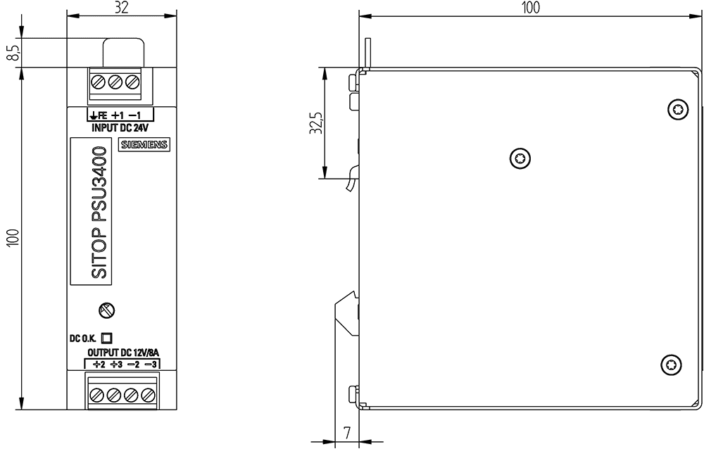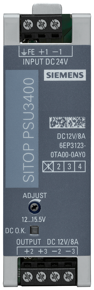 SITOP PSU3400 12 V/8 A alimentatore stabilizzato ingresso: DC 24 V (14 … 32 V) uscita: DC 12 V/8 A Convertitore di tensione continua SITOP PSU3400 per unalimentazione di tensione stabile a 12 V o 24 V anche in caso di oscillazioni della tensione di ingresso. Il convertitore DC/DC SITOP PSU3400, grazie al suo ampio campo della tensione di ingresso, è perfettamente adatto per il funzionamento con tutte le batterie di uso corrente.