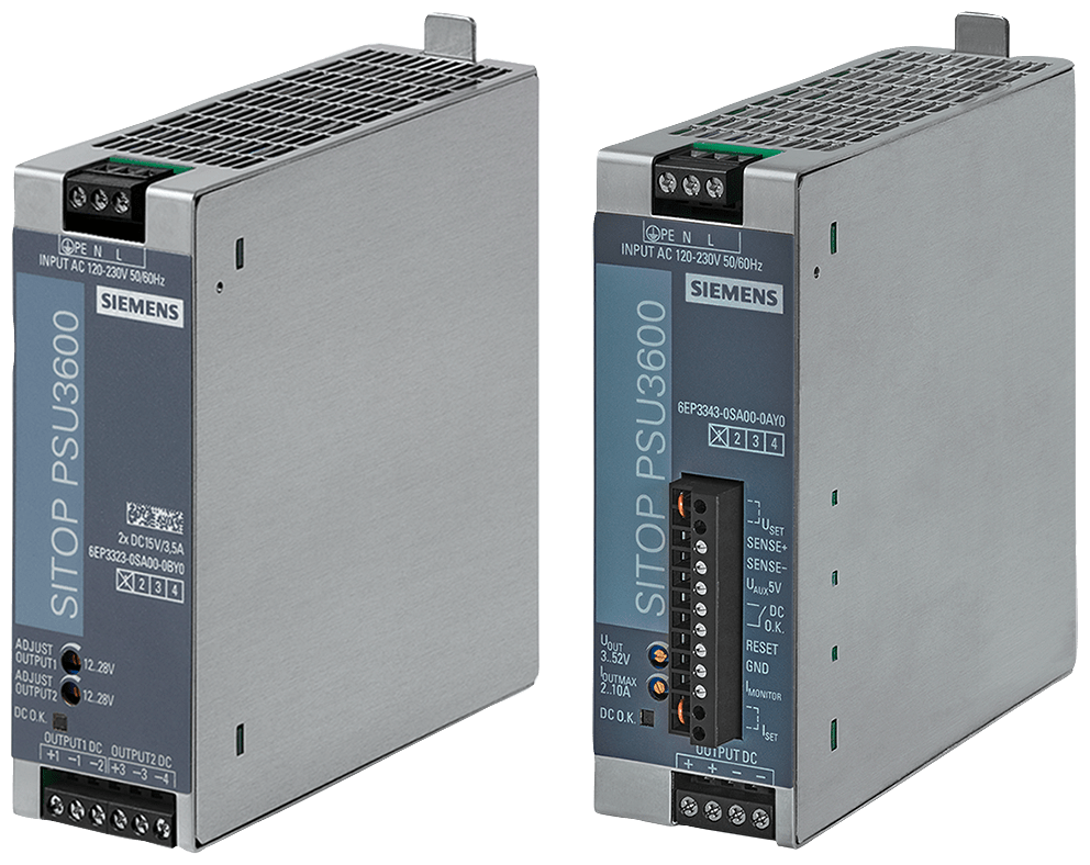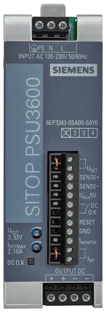 SITOP PSU3600 flexi alimentatore stabilizzato ingresso AC 120-230 V uscita: DC 3-52 V/10 A, 120 W Lalimentatore monofase SITOP PSU3600 flexi dispone di una tensione di uscita impostabile in modo flessibile da 3 a 52 V. È adatto per tutti i campi di impiego che richiedono una tensione speciale diversa da 24 V. Non si deve pensare solo allimpiego convenzionale come alimentatore. La possibilità di variare la tensione di uscita anche dinamicamente durante il funzionamento, ad es. il comando del numero di giri di motori DC/ventilatori oppure per ladattamento della tensione in banchi prova nonché numerosefunzioni speciali come cavo Sense e monitor di corrente, consentono un ampio campo di applicazioni. Indipendentemente dal settore o dallesigenza, Siemens offre alimentatori affidabili ed efficienti per ogni impianto.