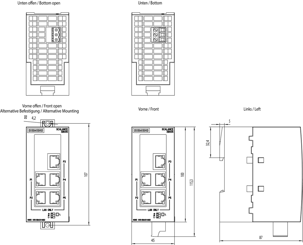 SCALANCE XB005 unmanaged Industrial Ethernet Switch per 10/100 Mbit/s; per la configurazione di piccole strutture a stella e strutture lineari; diagnostica LED, IP20, AC/DC 24V alimentazione di tensione, con 5x 10/100 Mbit/s Twisted Pair Ports con prese RJ45; manuale disponibile come download . SCALANCE XB005 unmanaged switch compatto, 5x RJ45 da 10/100 Mbit/s per piccole reti IE. Funzionali, compatti e adatti alluso industriale: gli switch SCALANCE X-B005 offrono sempre lo switch Compact Ethernet giustoper garantire una semplice interconnessione di macchine in rete. Grazie a varianti che possono avere da 5 a 8 porte è possibile realizzare senza problemi anche trasmissioni dati nellordine dei gigabit. I Compact Switch Module (CSM) permettono di realizzare un collegamento economico ai controllori SIMATIC e quindi lintegrazione delle macchine negli impianti esistenti. Con i nostri switch unmanaged e CSM robusti e facili da utilizzare, è possibile creare reti Industrial Ethernet a costi vantaggiosi.