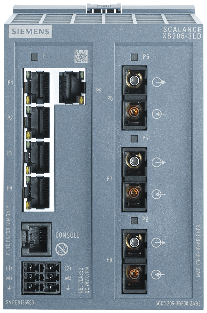 SCALANCE XB205-3LD manageable Layer 2 IE Switch 5x porte RJ45 da 10/100 Mbit/s 3x porte SC SM FO 1x porta di console, LED di diagnostica, ridondante alimentazione di tensione; certificato IEC 62443-4-2; campo di temp. 0°C ... +60°C; montaggio su guida profilata; PROFINET predefinito. SCALANCE XB205-3LD managed, box switch di Layer 2, 5x RJ45 da 10/100 Mbit/s, 3x singlemode SC per PROFINET ed EtherNet/IP, default: PROFINET. Indicato per numerose applicazioni: Lo SCALANCE XB205-3LD offre unampia varietà diswitch Ethernet altamente performanti in diverse varianti: dagli switch Gigabit agli switch robusti per i requisiti dellautomazione discreta e di processo. I potenti switch Gigabit SCALANCE XB205-3LD sono stati sviluppati per rispondere ai difficili requisiti delle reti negli ambienti industriali. Grazie allhardware potente e alle funzioni avanzate, assicurano uninfrastruttura di rete affidabile e scalabile per qualsiasi applicazione. Realizzazione semplice e affidabile di molte applicazioni industriali.