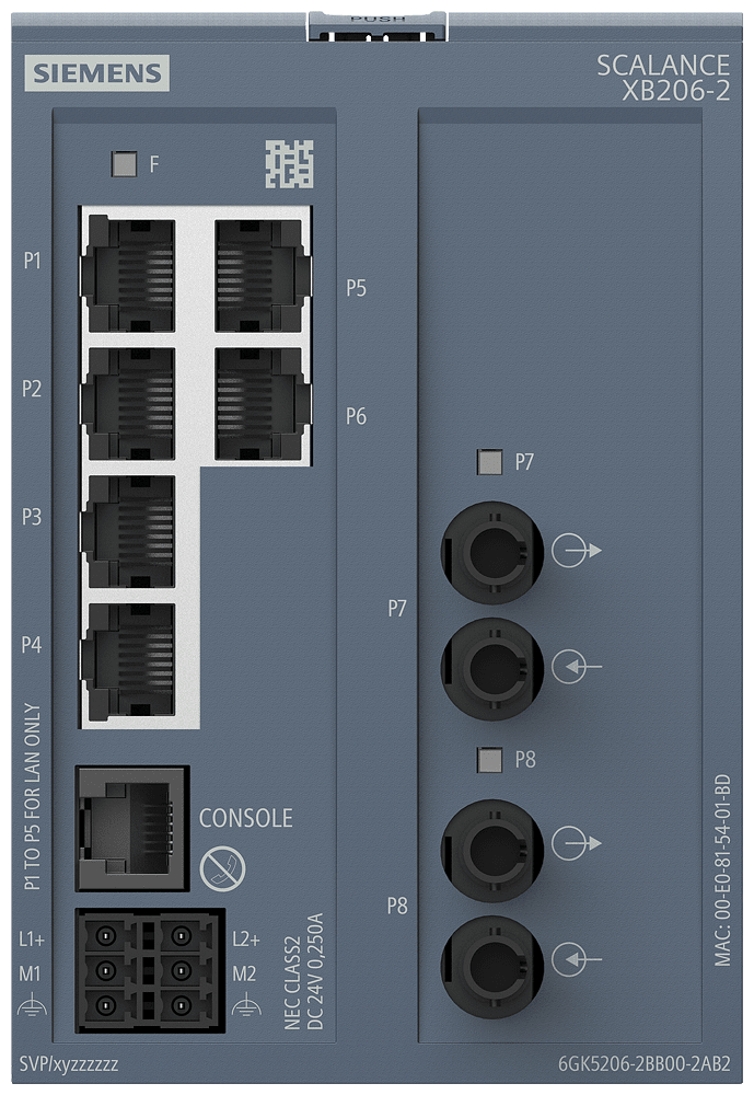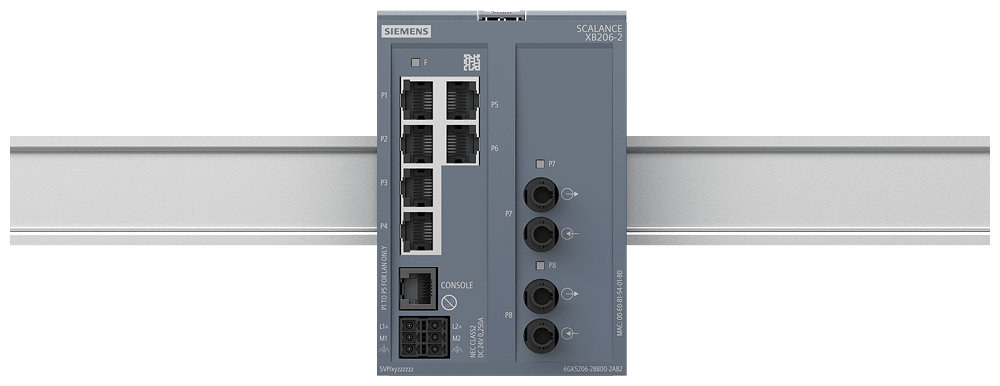 switch SCALANCE XB206-2 managed Layer 2 IE 6x porte RJ45 da 10/100 Mbit/s 2x porte MM FO ST 1x porta di console, LED di diagnostica, ridondante alimentazione di tensione; certificato IEC 62443-4-2; campo di temp. 0°C ... +60°C; montaggio su guida profilata; PROFINET predefinito. SCALANCE XB206-2 managed, box switch di Layer 2, 6x RJ45 da 10/100 Mbit/s, 2x multimode ST/BFOC per PROFINET ed EtherNet/IP, default: PROFINET. Installazione nel quadro elettrico per applicazioni per PROFINET ed EtherNet/IP. Impostazioni PROFINET standard. Supporto di entrambi i protocolli industriali (PROFINET ed EtherNet/IP) in una apparecchiatura per limpiego nella comunicazione in tempo reale. Elevata disponibilità della rete con la realizzazione di strutture ad anello ridondanti sulla base di High Speed Redundancy (HRP), ridondanza ad anello MRP conforme a PROFINET, manager di ridondanza integrato. Supporto della limitazione del carico con limpiego di protocolli basati su multicast nonché limitazione di multicast e broadcastper ogni porta. Realizzazione di reti virtuali con la funzione VLAN. Web Server integrato e contatto di segnalazione per una diagnostica semplice e rapida sullapparecchiatura e integrazione in sistemi di Network Management già esistenti tramite accesso SNMP standardizzato. Managed, box switch di Layer 2, DC 24 V, 6x porte RJ45 elettriche da 10/100 Mbit/s, 2x multimode ST/BFOC, 1x porta di console, default: PROFINET. Ampia gamma di accessori come ad es. SITOP PSU100C 24 V/0,6 A per lalimentazione stabilizzata, FC FO Plugs e valigia per il confezionamento in proprio di cavi in fibra ottica (ST/BFOC) per il montaggio sul posto, connettori RJ45, blocco morsetti per contatto di segnalazione e diverse varianti di cavi FastConnect (anche preconfezionati) a completamento del sistema. Switch to the future - SCALANCE X.