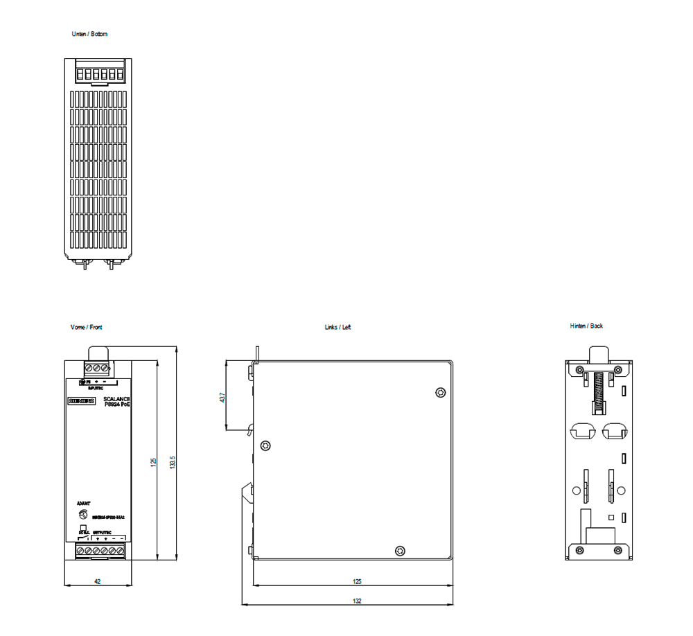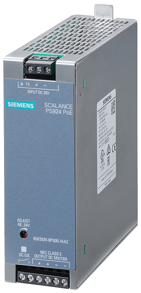 SCALANCE PS924 PoE Power-Supply per Power-over-Ethernet, ingresso: uscita DC 24 V: DC 54 V/1,6 A NEC classe 2. SCALANCEAlimentatore SCALANCE PS924 PoEConcepito per limpiego nel quadro elettrico (grado di protezione IP20) insieme con switches, in ambientigravosi con un campo di temperatura ambiente da -40 °C a +70 °C.Potenza elevata possibile (fino a 120 W) sulle porte dello switch per nodi/partner Power-over-Ethernet (PoE) collegati. Tipici nodi/partner, i cosiddetti Powered Device (PD), sono ad es. WLAN Access Points, RFID Readers, telecamere, telefoni IP etc. Vantaggi di PoE: Onere di cablaggio ridotto grazie allutilizzo del cavo dati sia per la trasmissione di dati sia per lalimentazione di tensione al nodo/partner collegato. Risparmio di spazio grazie alla forma costruttiva compatta e al montaggio su guida DIN. Installazione semplice grazie alla classificazione come sorgente di corrente con potenza limitata (LPS / NEC Class 2). Robusta custodia in metallo adatta allimpiego industriale in ambienti con forti sollecitazioni climatiche.
